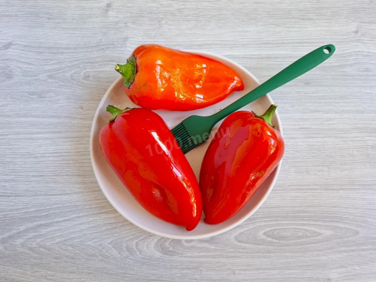 Болгарские перцы вымойте в проточной воде и обсушите бумажным полотенцем. Поверхность перцев смажьте растительным маслом при помощи кулинарной кисти или воспользуйтесь распылителем масла.