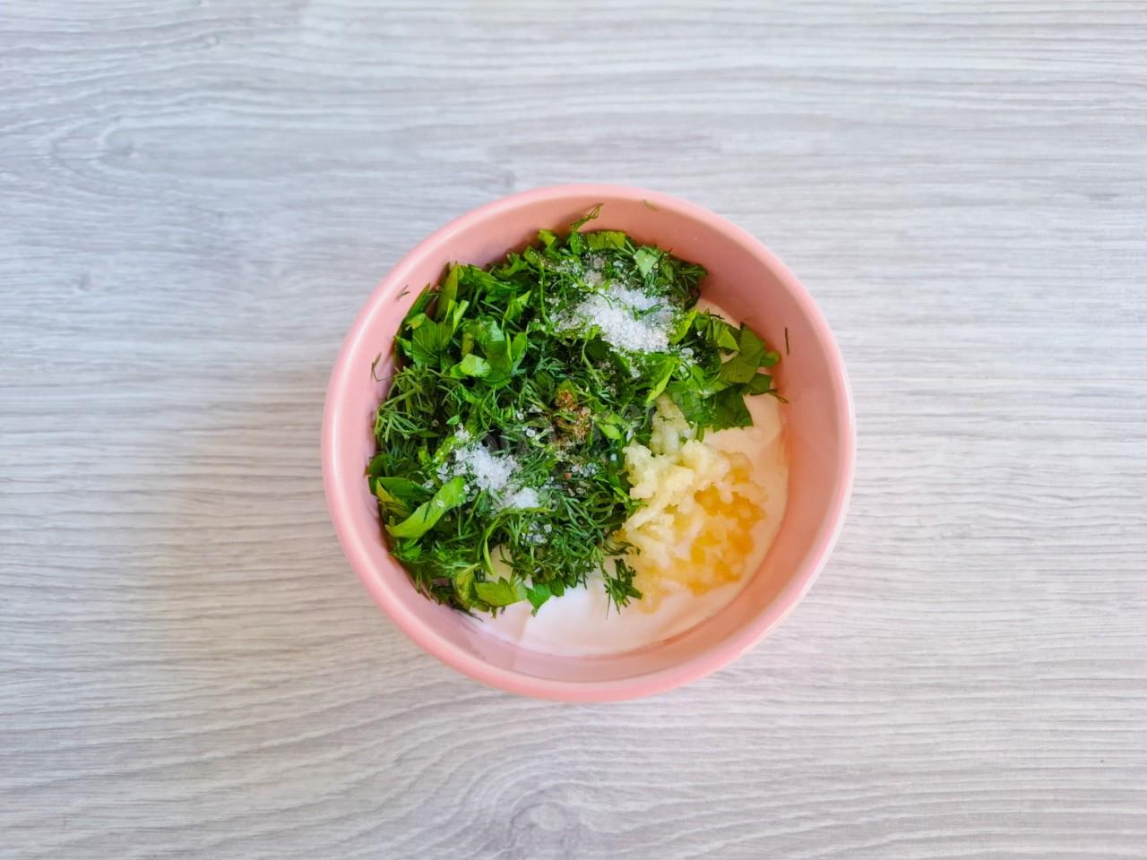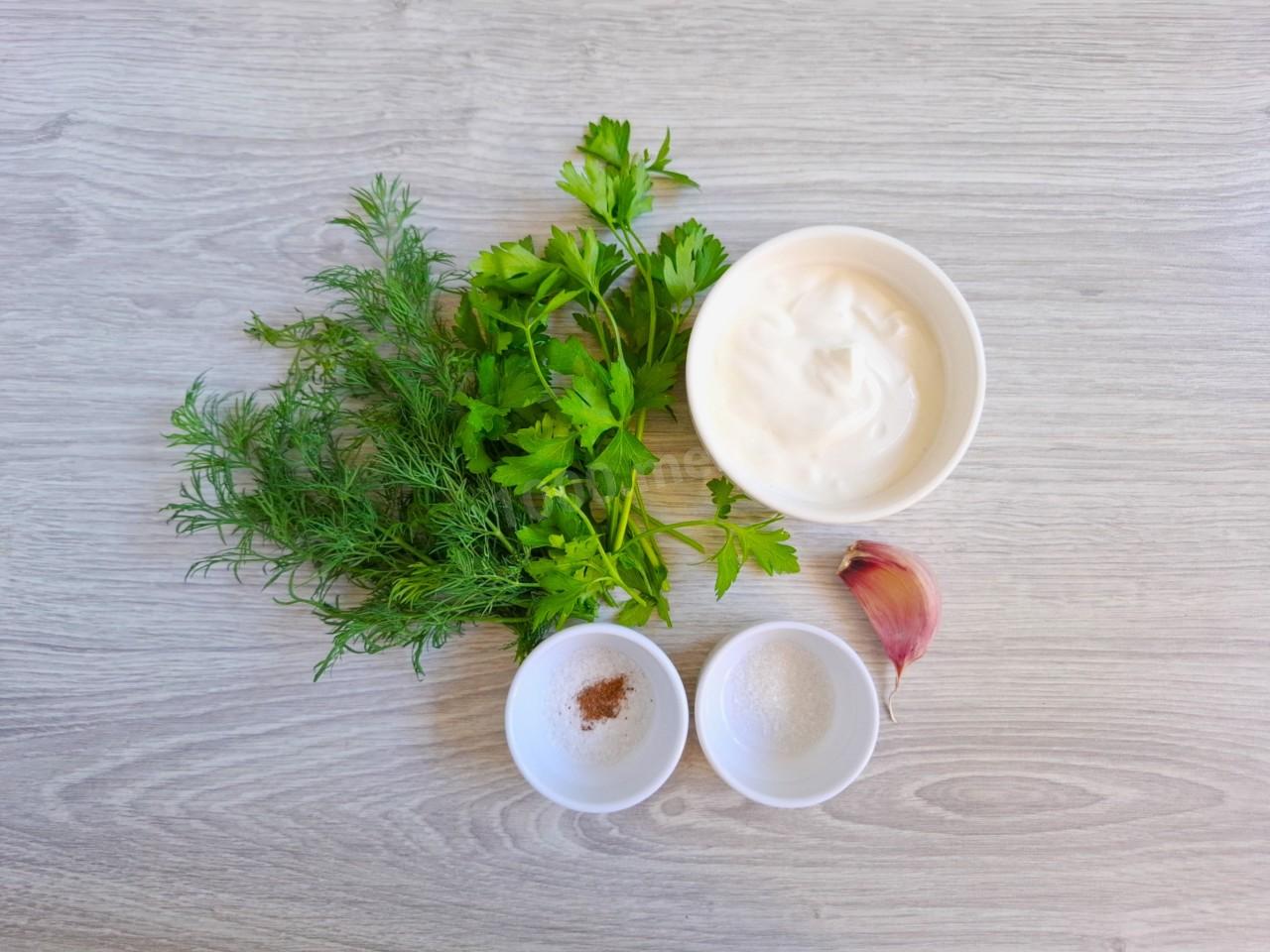 Подготовьте необходимые продукты. Сметану берите любой жирности. Главное, чтобы она была натуральная и вкусная. Заменить ее можно натуральным йогуртом без добавок. Зелень подойдет любая на ваш вкус. Например: укроп, петрушка, базилик, кинза. Я взяла укроп и петрушку. Количество специй и чеснока берите на свой вкус. Полезные советы о применении сметаны читайте в статье по ссылке ниже.