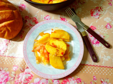Картошка получилась отменная. Лук придал приятную сладость всему блюду и вместе с натертым помидором образовал что-то вроде соуса, очень вкусного. Картофель отлично пропекся, но при этом сохранил форму и при накалывании вилкой не разваливается.
