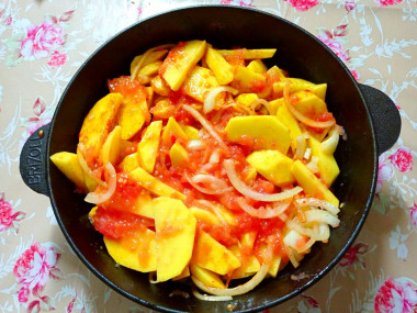 Для запекания я использовала чугунную форму. Всё сделала согласно рецепту, только помидоры я не стала нарезать кружочками, а просто натерла на терке, иначе дочь бы все помидорные кружочки забраковала и не стала бы есть.