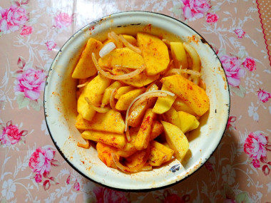 Смешайте нарезанный картофель с нарезанным луком и посолите. Также на этом этапе вы можете добавить в блюдо и какие то свои любимые приправы: возможно, чесночный порошок, прованские травы, молотый душистый перец или хмели-сунели. Выбирайте на свой вкус!