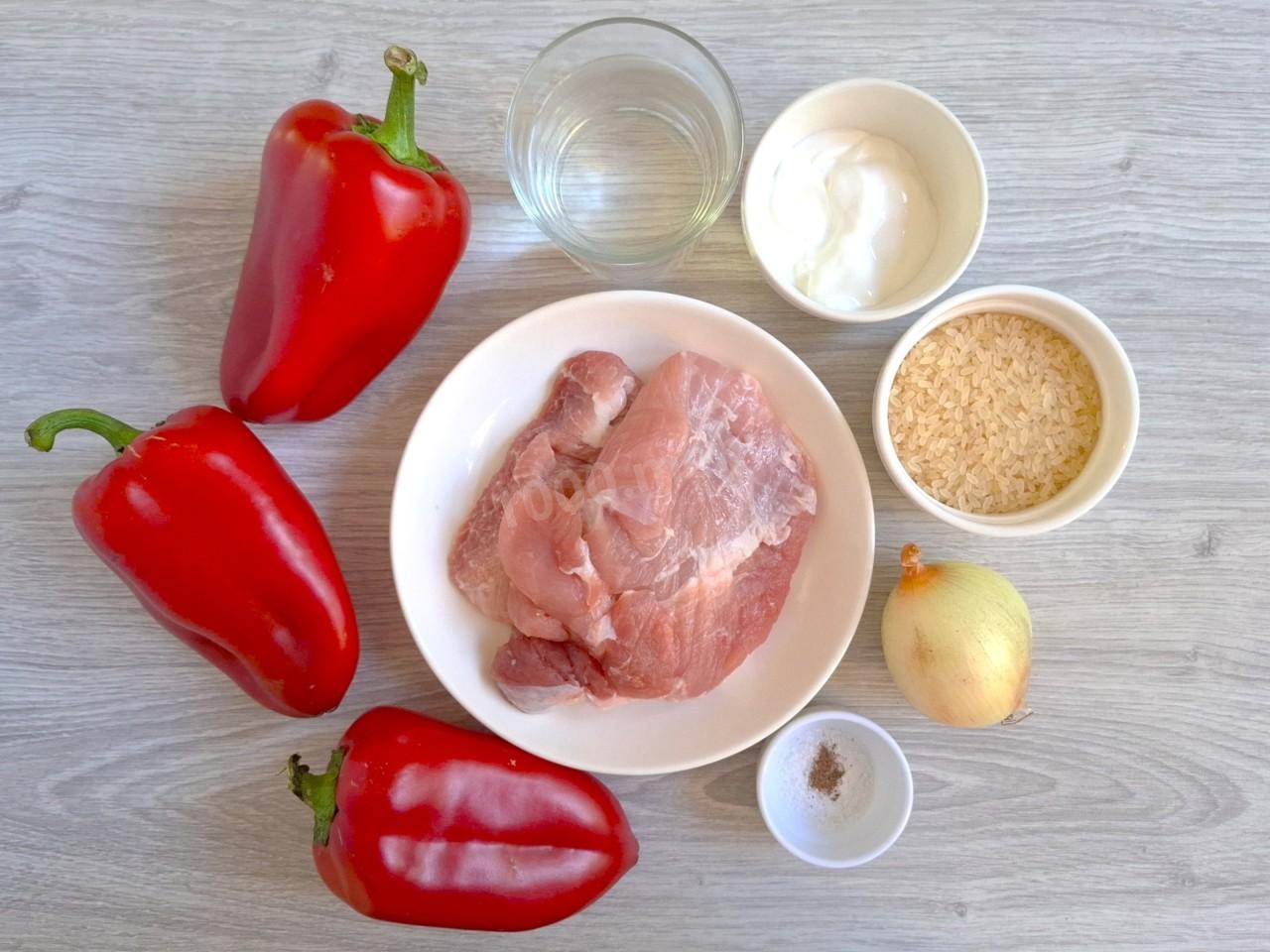 Подготовьте необходимые ингредиенты. Болгарские перцы лучше выбирать крупные и мясистые без признаков порчи. Кроме свинины, можно взять любое другое мясо или готовый фарш, но время приготовления и калорийность изменятся. Если мясо заморожено, предварительно разморозьте его. О правильной разморозке читайте по ссылке ниже. Рис подойдет любой на ваш выбор. Сметану можно взять любой жирности или заменить на натуральный йогурт или майонез.