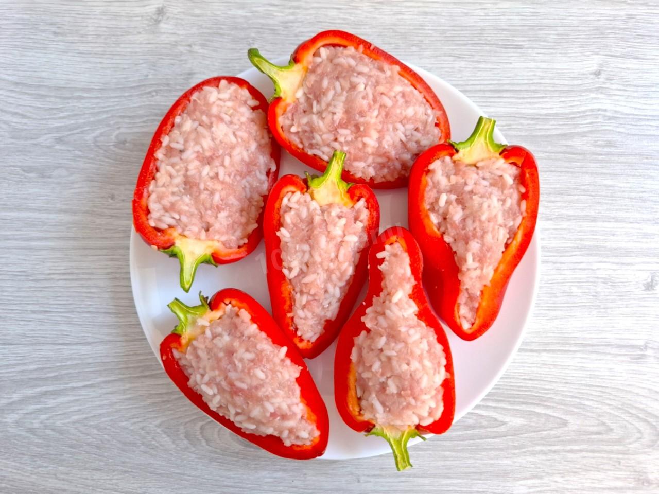 Болгарские перцы тщательно вымойте в проточной воде и обсушите бумажным полотенцем. Разрежьте их вдоль пополам и вычистите семена, хвостики оставьте. Заполните лодочки из перцев подготовленным фаршем. Укладывайте фарш плотно, не оставляя пустот, но не переусердствуйте, чтобы не повредить перцы.