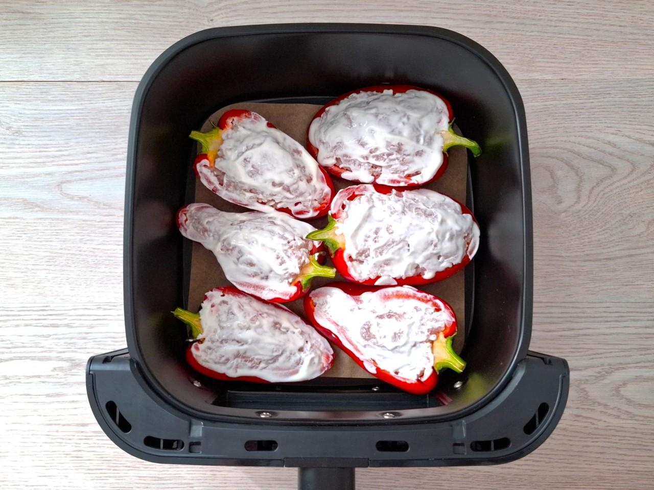 Чашу аэрогриля застелите пергаментом, проделав в нём несколько небольших отверстий для циркуляции горячего воздуха. Или смажьте чашу растительным маслом. Также можно использовать силиконовую форму. Выложите начиненные перцы в чашу и обильно смажьте поверхность каждого чайной ложкой сметаны. Подробнее о выборе пергамента читайте в статье по ссылке под шагами.