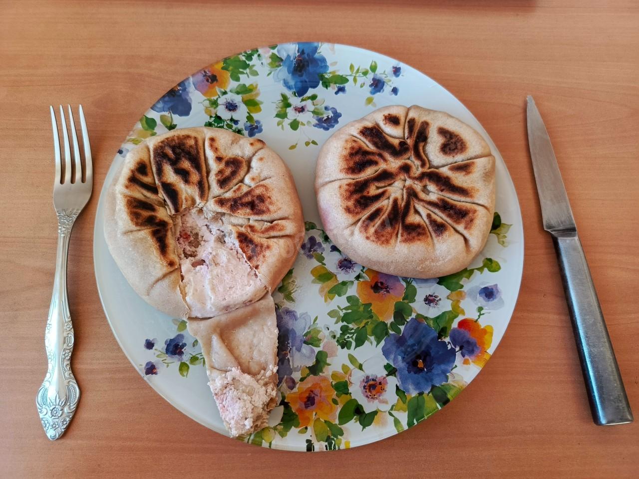5) слепить изделие путём выкладывания начинки на тонко раскатанную часть теста и формирования плоского пирожка произвольной формы