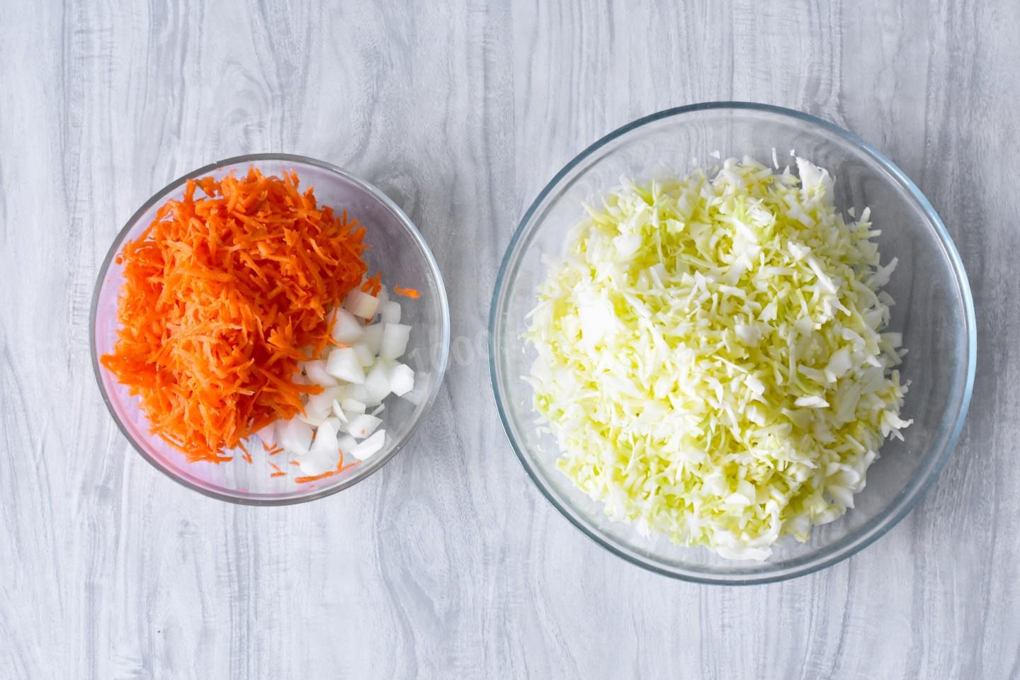 Морковь тщательно вымойте с помощью жесткой мочалки или щётки, очистите от кожуры. С капусты снимите внешние листья, ополосните капусту под проточной водой. Капусту мелко нашинкуйте. Морковь натрите на крупной терке. Лук очистите и нарежьте мелкими кубиками. Чтобы при нарезке лука не раздражалась слизистая, смочите луковицу и нож ледяной водой. Подробнее о работе с привычной кухонной тёркой читайте по ссылке ниже.