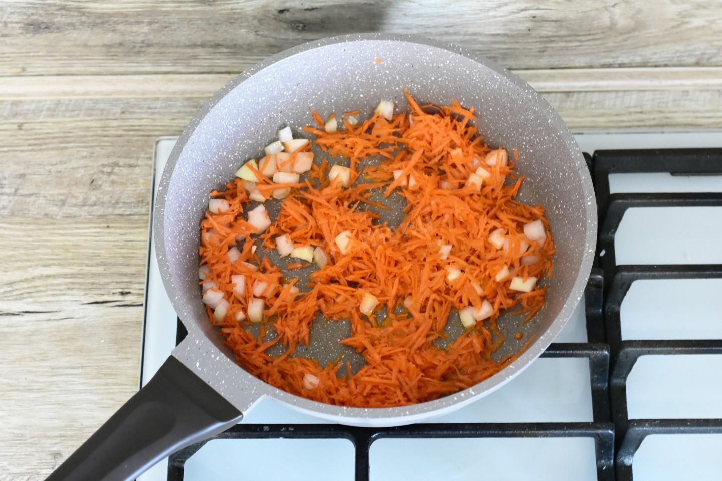На сковороде разогрейте часть растительного масла и обжарьте лук с морковью до мягкости на небольшом огне, периодически помешивая. Следите, чтобы овощи стали мягкими и слегка золотистыми, но не подгорели. Зажарку снимите с огня и охладите при комнатной температуре. О том, как подобрать сковороду и растительное масло для жарки, читайте по ссылкам в конце рецепта.
