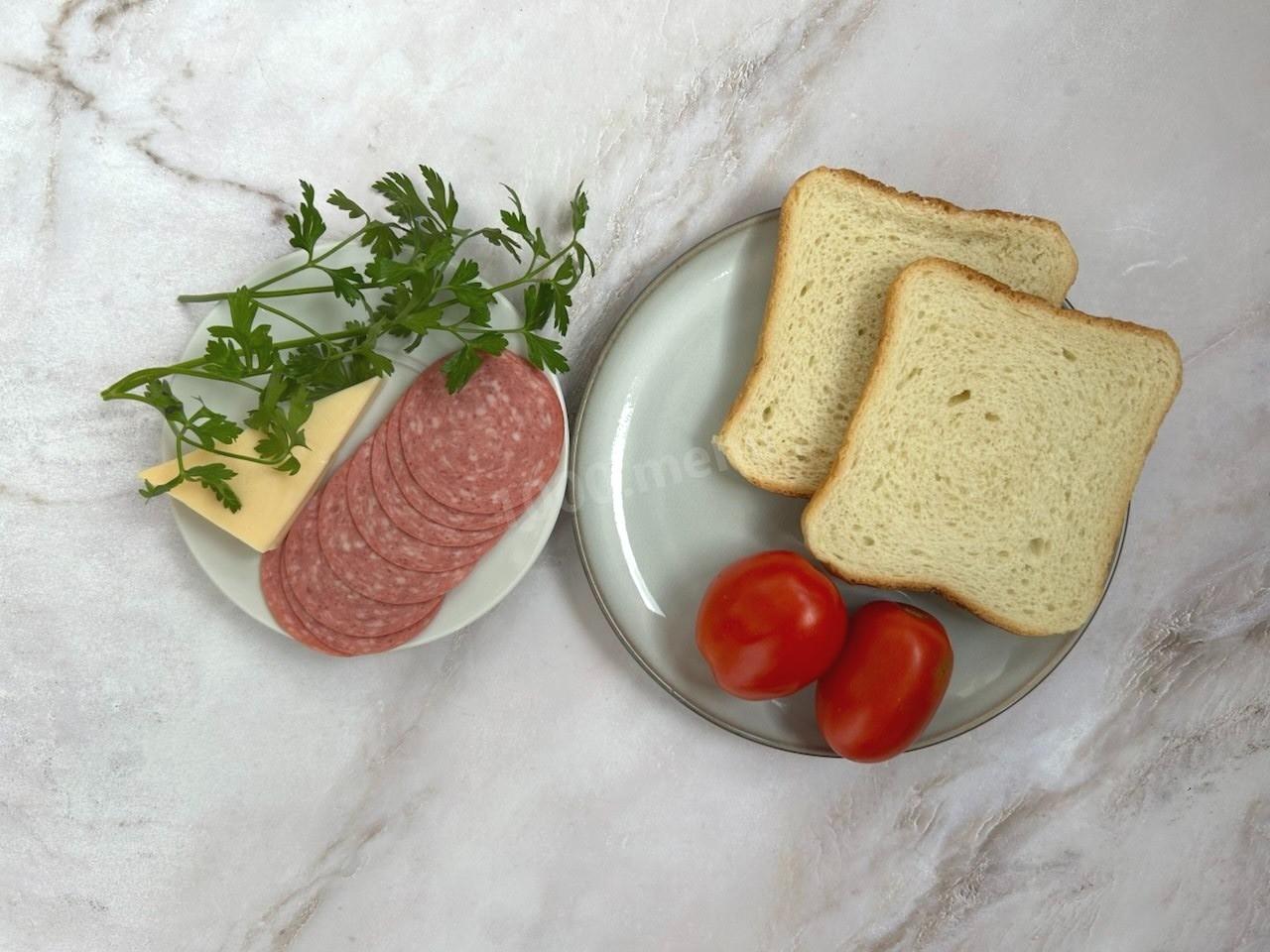 Очень просто. Хлеб можете взять любой — цельнозерновой, ржаной или батон. Колбаса также пойдет любая — ветчина, вареная, копченая или сырокопченая. Твердый сыр берите тот который вам больше всего нравится, главное чтобы он хорошо плавился.