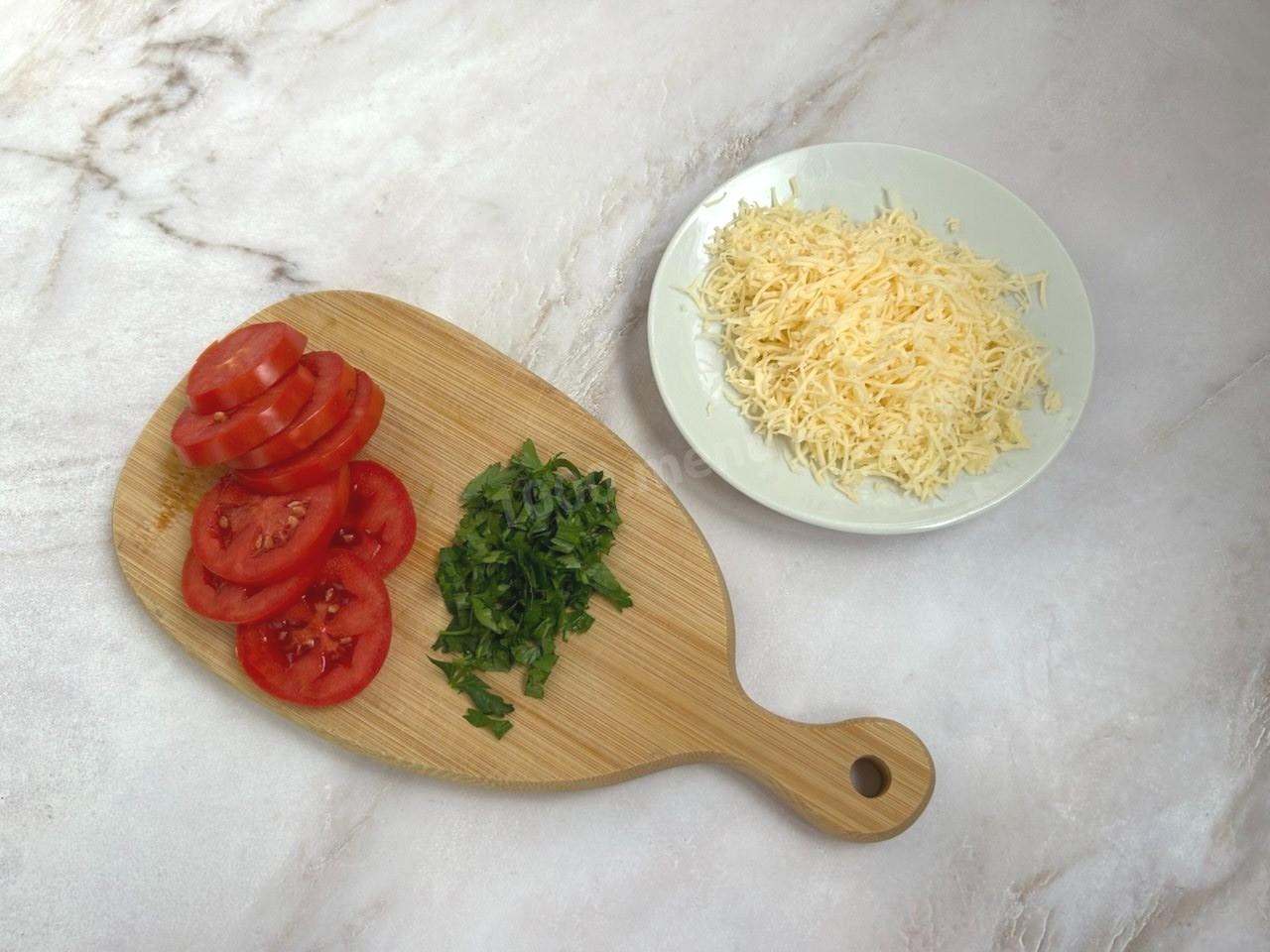 Помидоры помойте, обсушите и нарежьте на тонкие ломтики. Петрушку промойте и обсушите на бумажном полотенце. Удалите грубые стебли, а листочки мелко порубите. Сыр натрите на мелкой или средней терке. Смешайте натертый сыр с зеленью петрушки.