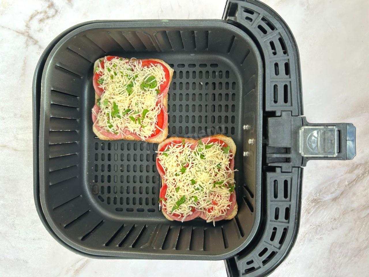 Запекайте 5 минут при температуре 200 градусов. Точное время будет зависеть от особенностей работы вашей техники. Подробнее об аэрогрилях читайте в конце рецепта.