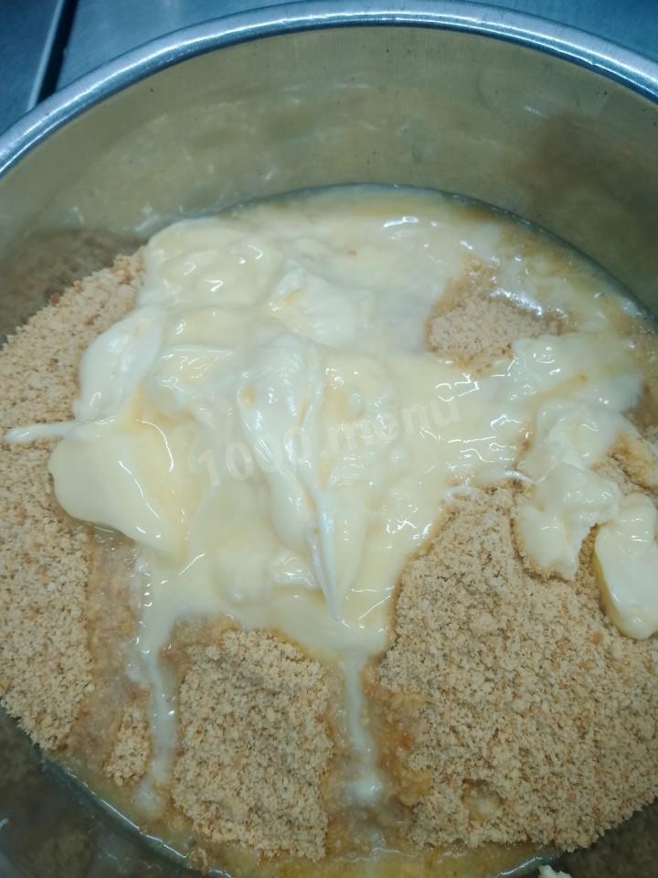 Печенье размельчить, в него вливаем сливочное масло. Хорошо все перемешиваем.