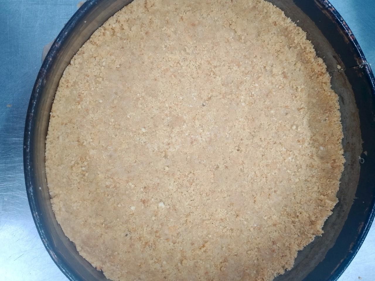 В форму выкладываем печенье с маслом, выравниваем дно и делаем не большой бортик, примерно 0.5см высотой. Убрать в морозилку на 1-1.5 часа.