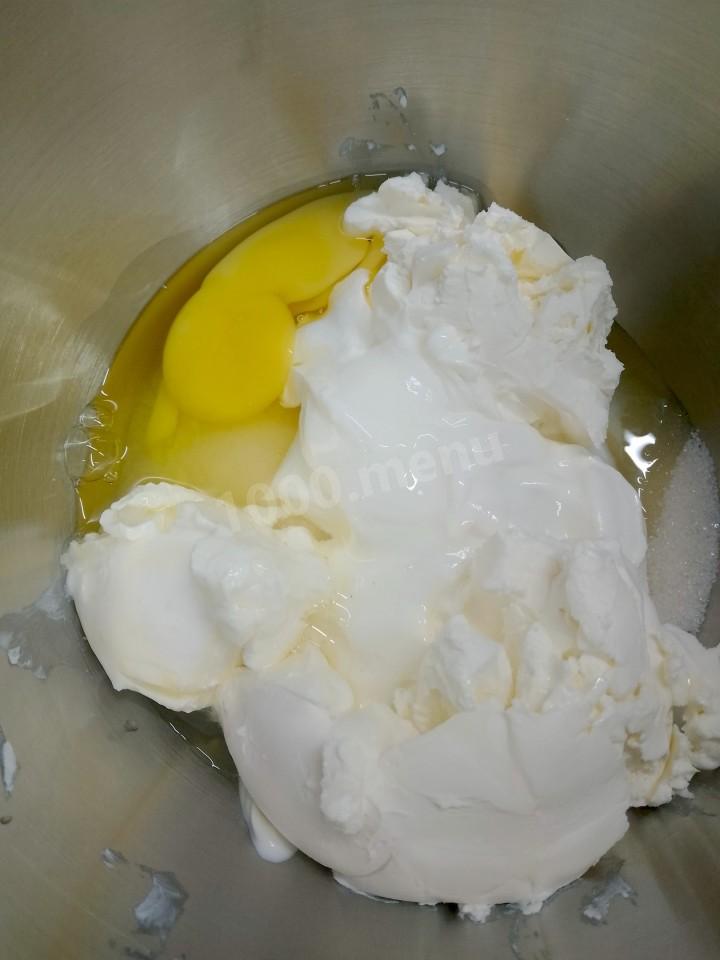 В миске смешиваем сыр твороженный, яйцо, сахар, сметану.