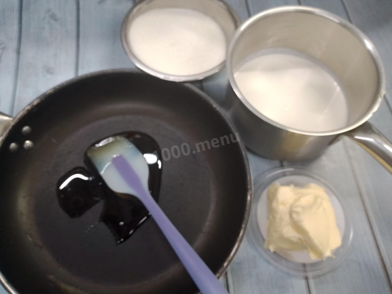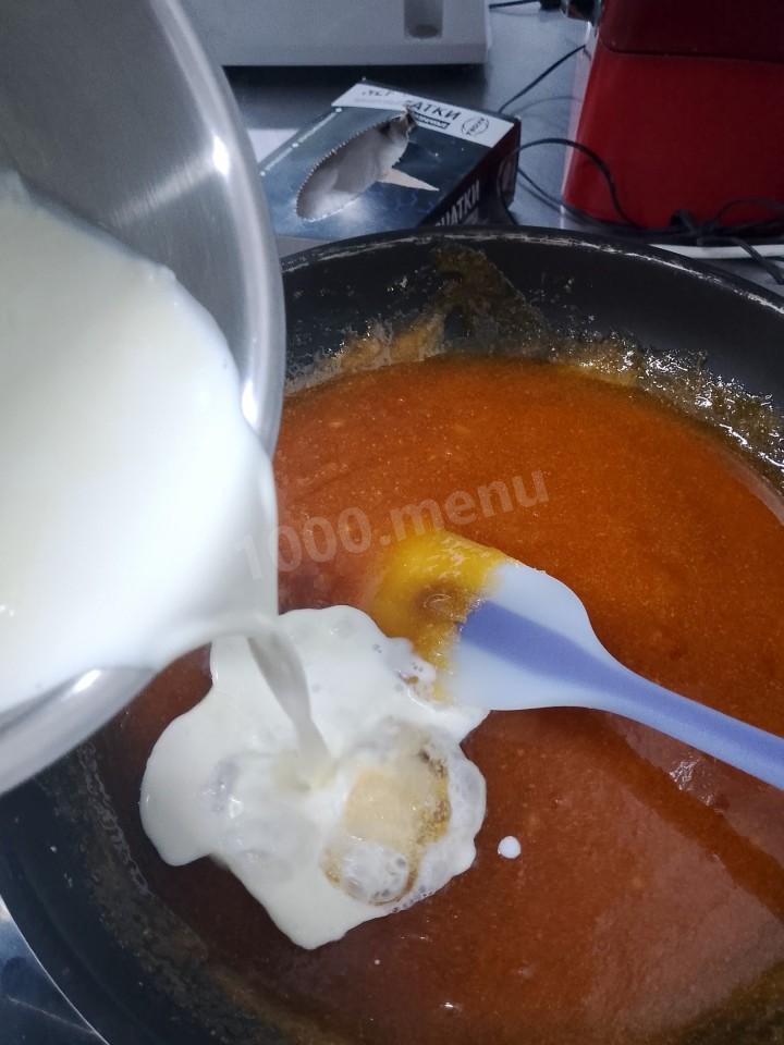 Сливки вскипятить, тоненькой струйкой вливаем в нашу карамель.