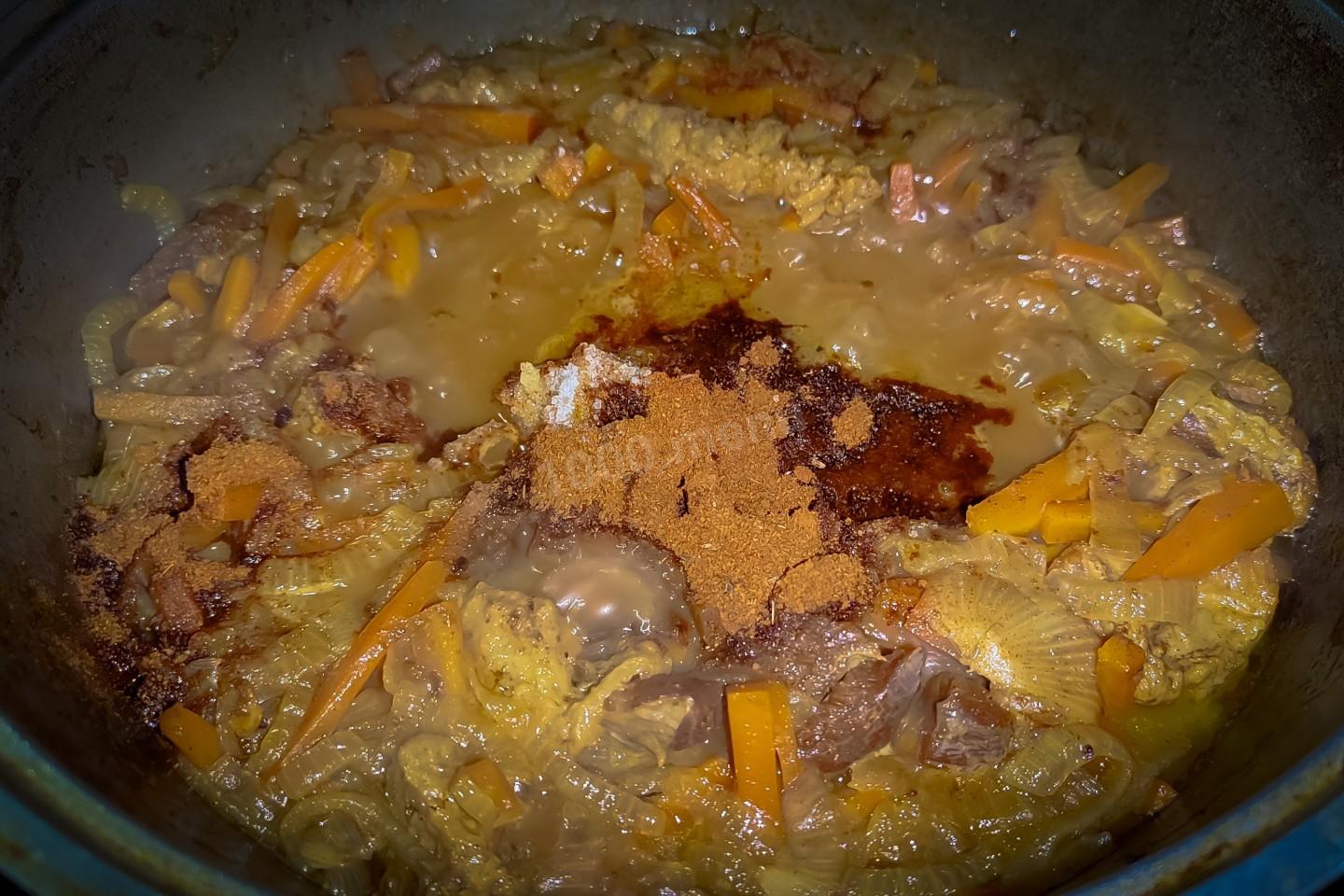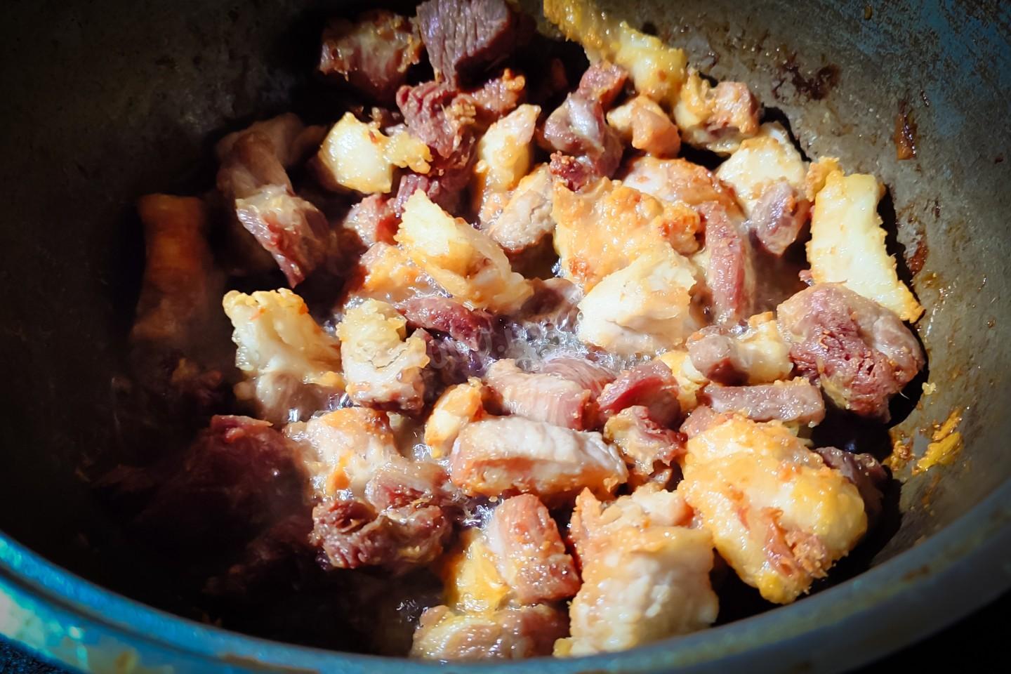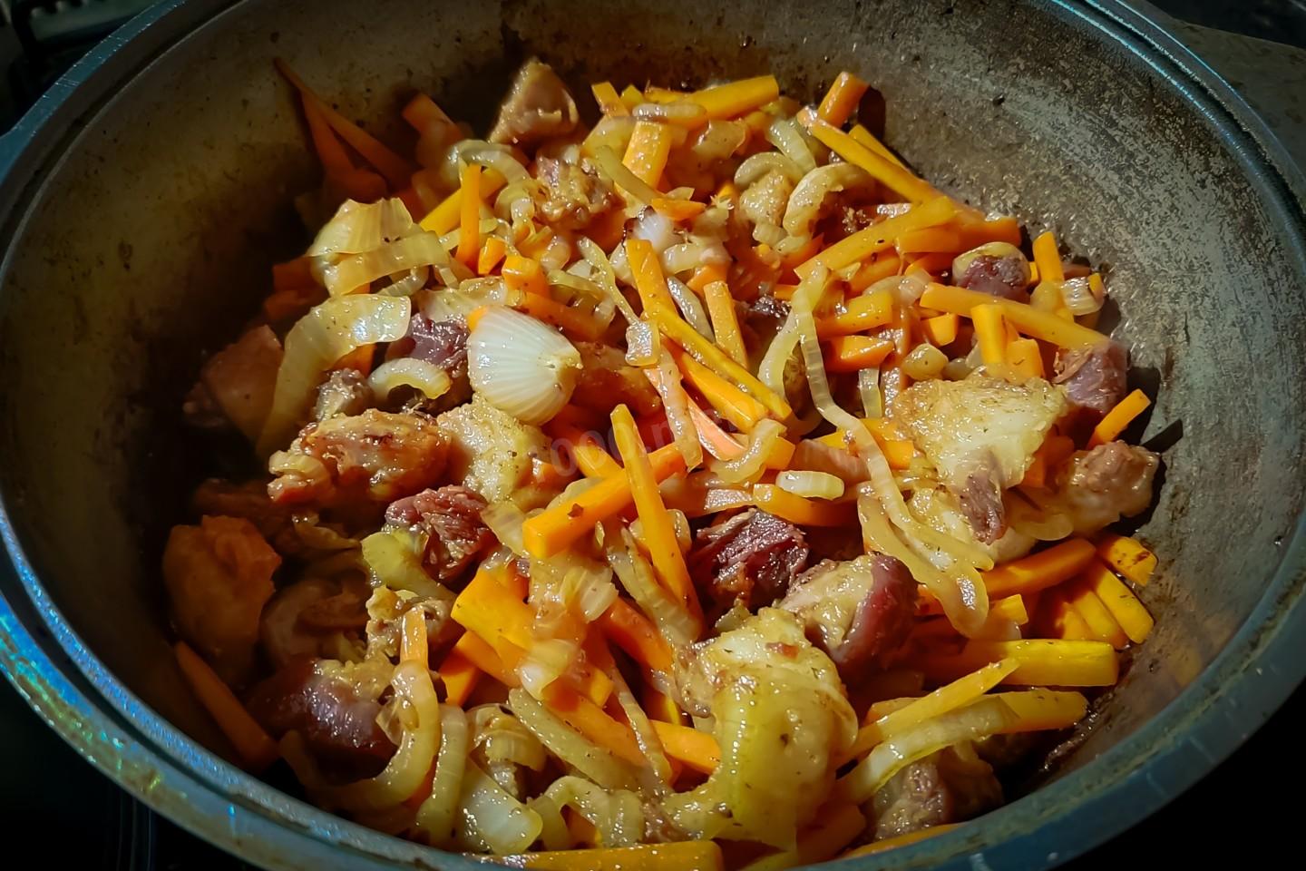 Через 5 минут обжаривания лука с морковкой, вернуть в казан мясо и продолжать обжаривать ещё 5 минут, постоянно перемешивая.
