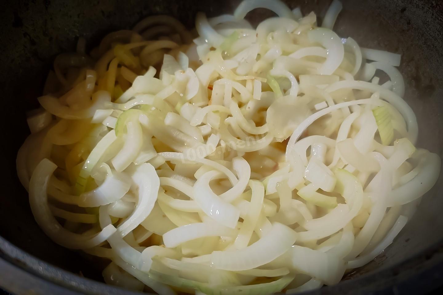 В казан пересыпать лук и, не убавляя огонь, периодически перемешивая обжарить его.