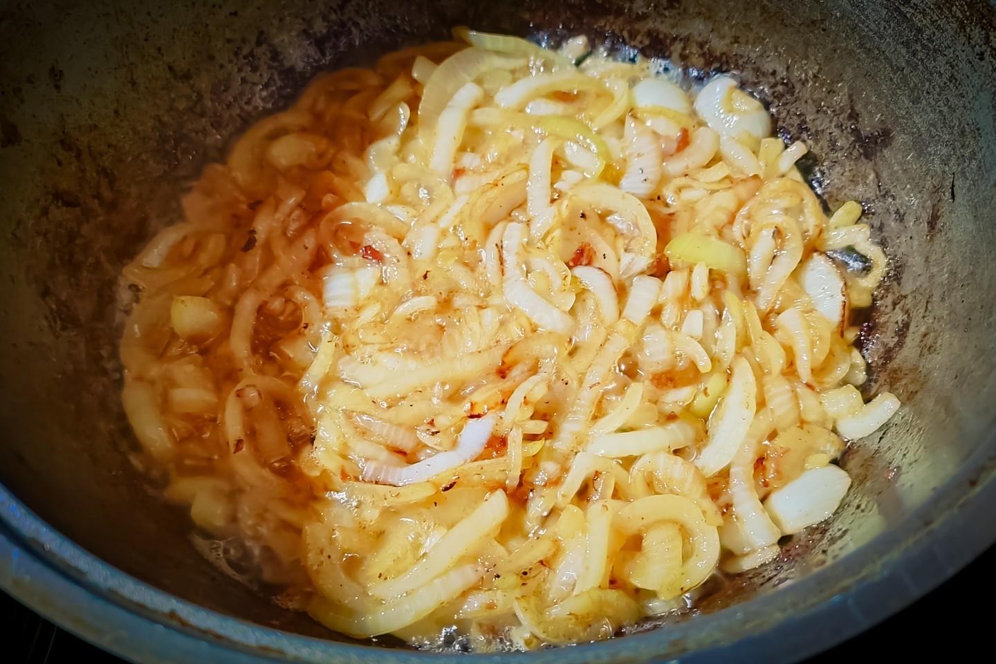 Когда лук начнёт карамелизироваться, продолжать его обжаривать постоянно перемешивая до получения светло-коричневого цвета.