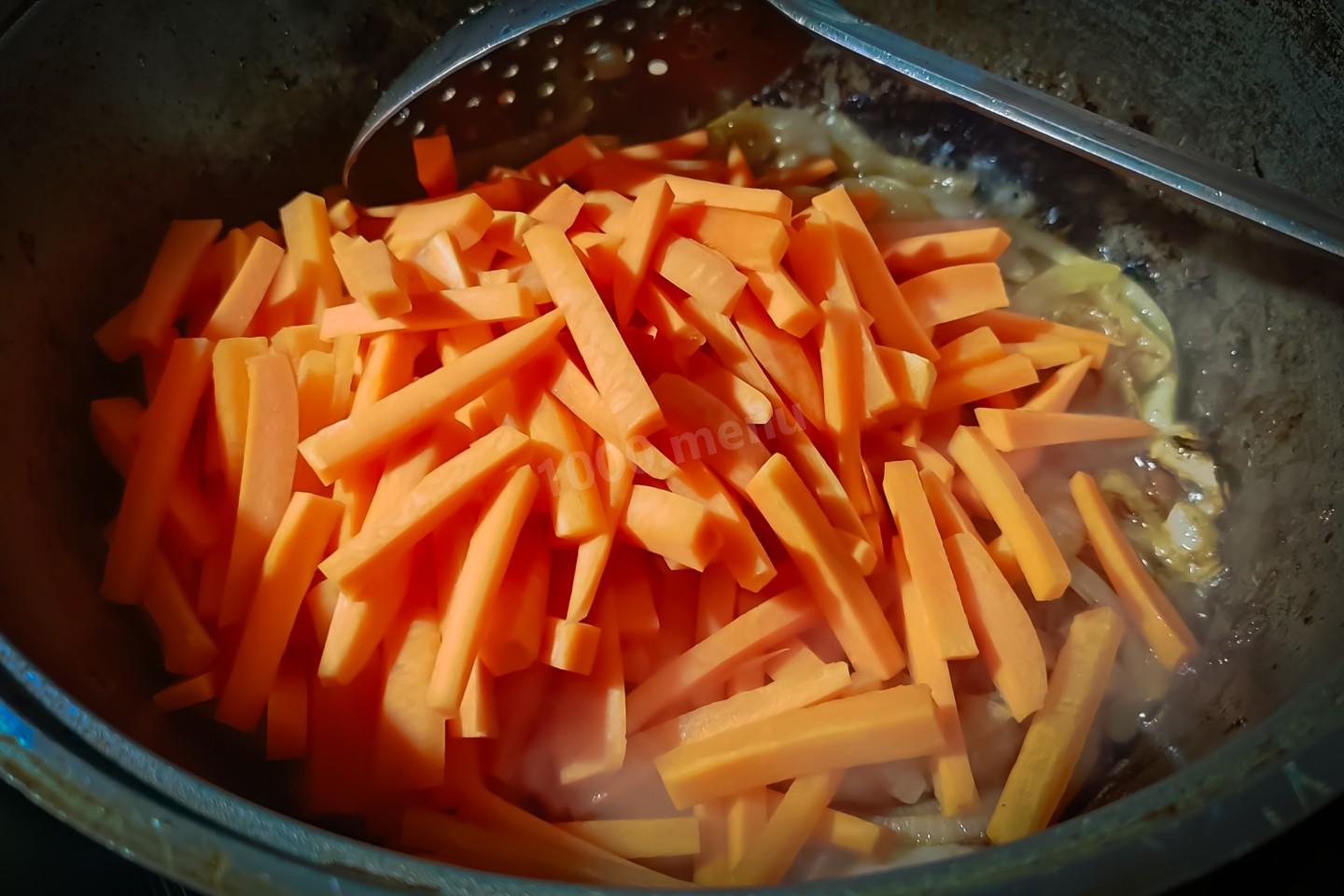 Морковь с луком хорошо перемешать и обжаривать минут 5 до размягчения морковки.