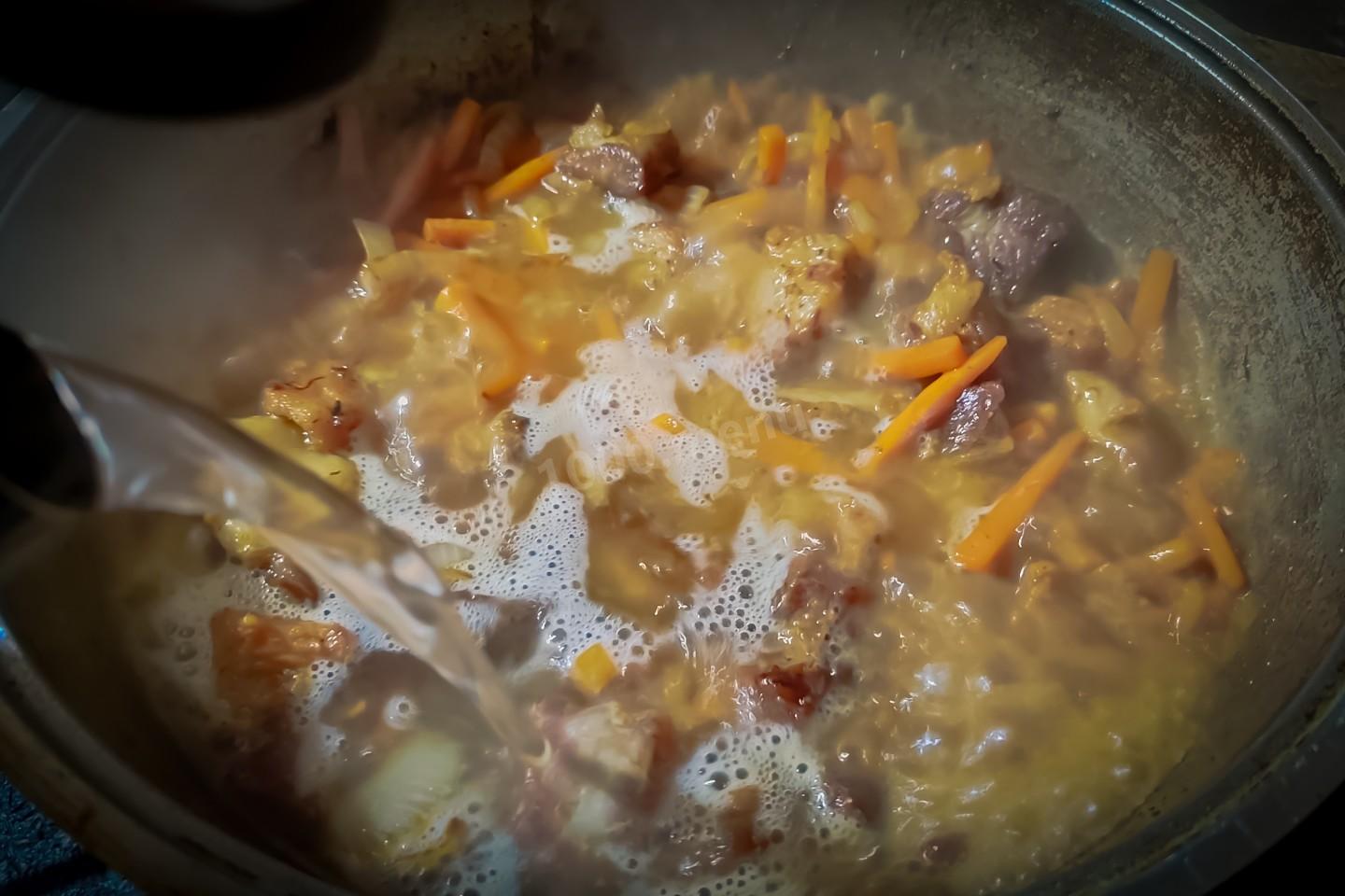 Теперь в казан влить кипяток (!) в количестве, чтоб на пару сантиметров покрыть содержимое казана.