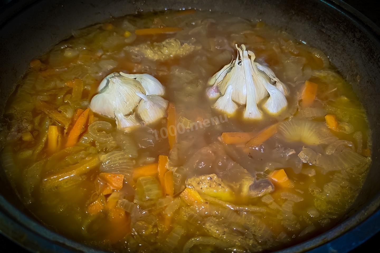 Теперь добавить в наш зирвак 2 головки чеснок. уменьшить огонь на минимум, накрыть казан крышкой и варить в течении часа на самом маленьком огне, чтоб содержимое казана кипело без бурления.