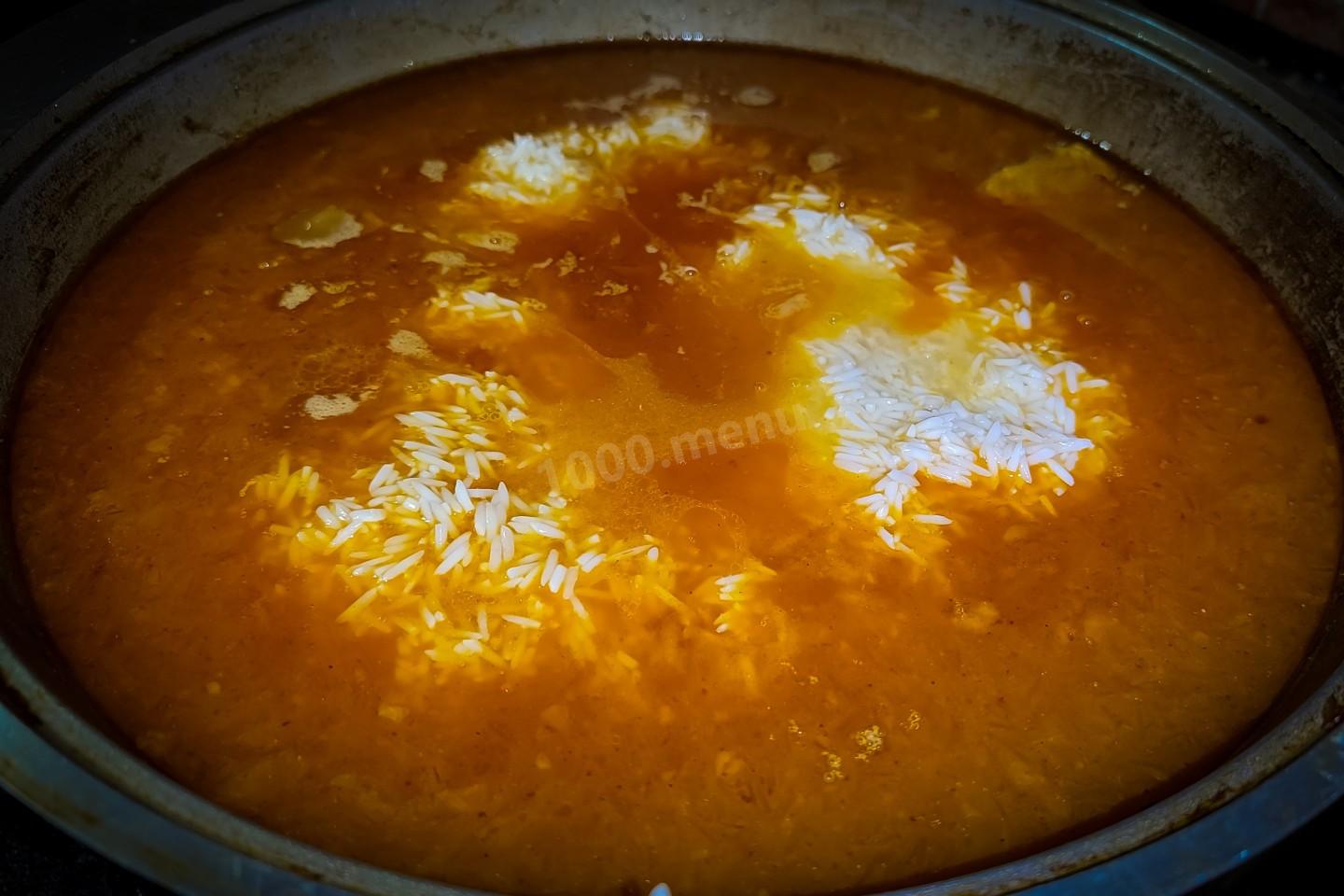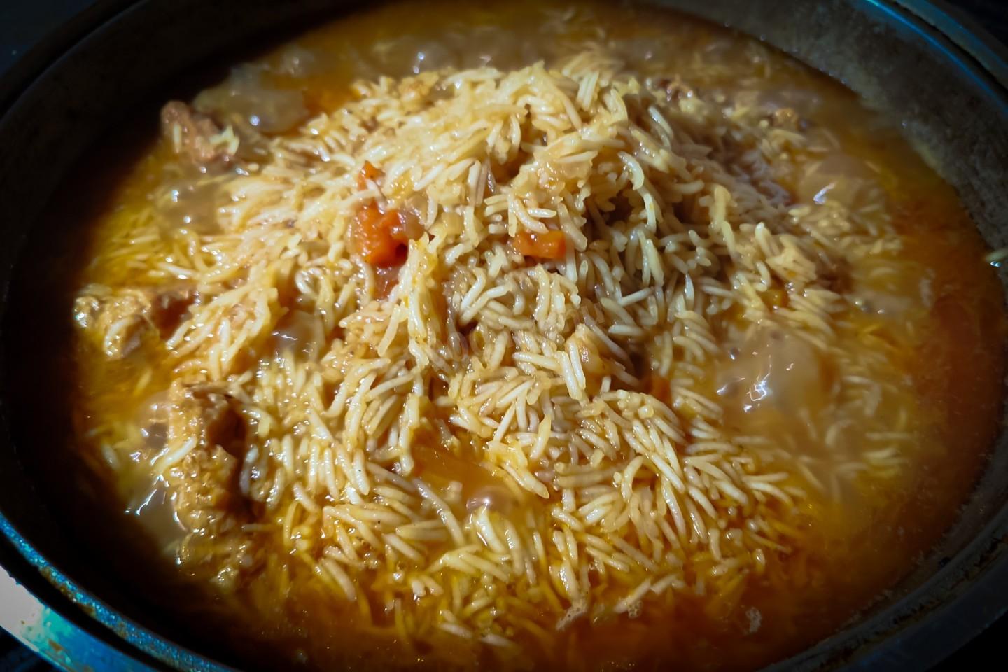 Когда зирвак будет готов и мясо станет мягким, перекладываем рис без воды. Перемешивать содержимое казана не надо, иначе рис прилипнет ко дну и начнёт подгорать, а вот просто шевелить только рис желательно. Накрыть крышкой и продолжать томить на самом слабом огне.