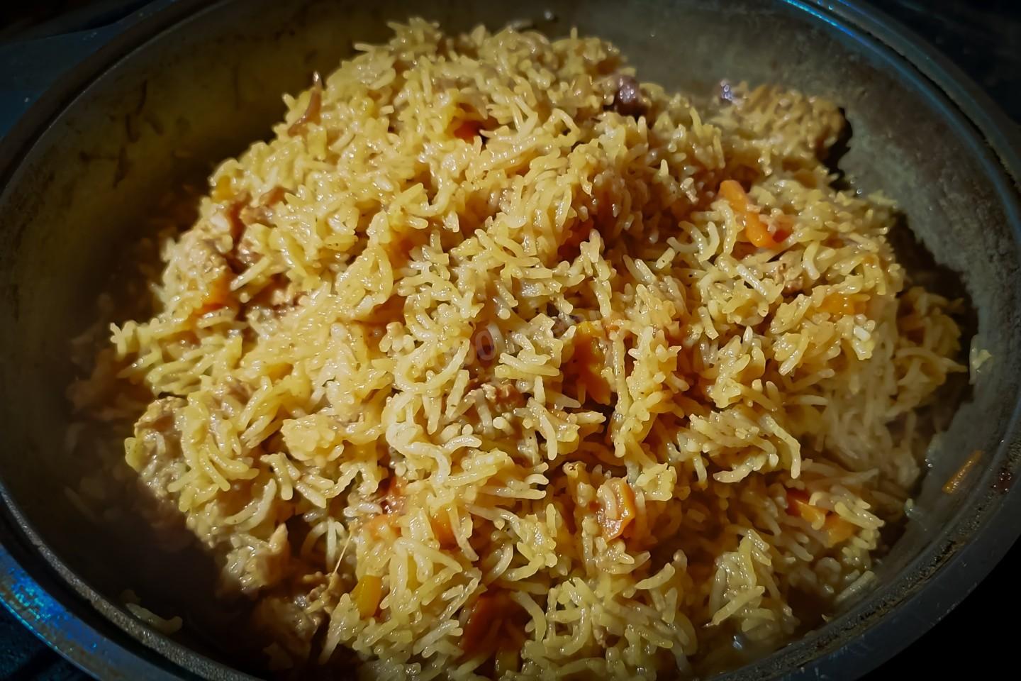 Продолжать готовить до полного впитывания жидкости. Когда жидкость вся впитается, накрыть казан крышкой, отключить огонь и укутать казан, чтоб всё хорошо пропарилось.