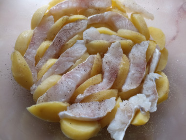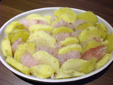 Для запекания возьмите любую жаропрочную форму и смажьте её растительным маслом. Я беру керамическую форму. Чередуя кусочки рыбы и картофеля, выложите все в формы для запекания. Посыпьте солью и специями.