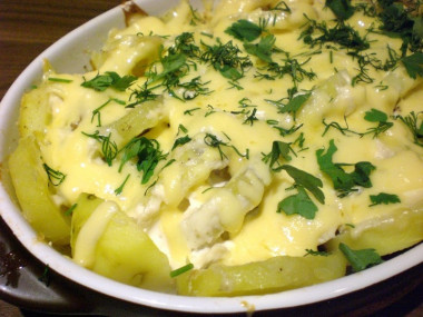 К обеду приготовила судака в духовке с картошкой запеченного. У меня было готовое филе, что конечно упрощает процесс приготовления. Очищенный картофель отварила до полуготовности. В жаропрочную кастрюлю выложила, чередуя, ломтики картофеля и кусочки рыбного филе. Присолила, посыпала черным перцем, сверху посыпала нарезанным репчатым луком. В форму долила воду, размешанную с майонезом и горчицей. Запекала минут 30, пока на дне кастрюли почти не осталось жидкости ( прозрачная форма позволяет это увидеть), после этого выложила на рыбу слой натёртого твердого сыра и запекала ещё минут 5, пока сыр полностью не расплавился и стал слегка румяниться. Получилось очень вкусно и ароматно! Кусочки рыбы сохранили сочность, картофель и лучок стали нежными, мягкими, горчица и майонез добавили насыщенности и пикантности, а слой расплавленного сыра прекрасно дополнил это отличное блюдо! Спасибо за рецепт, Юлия М!