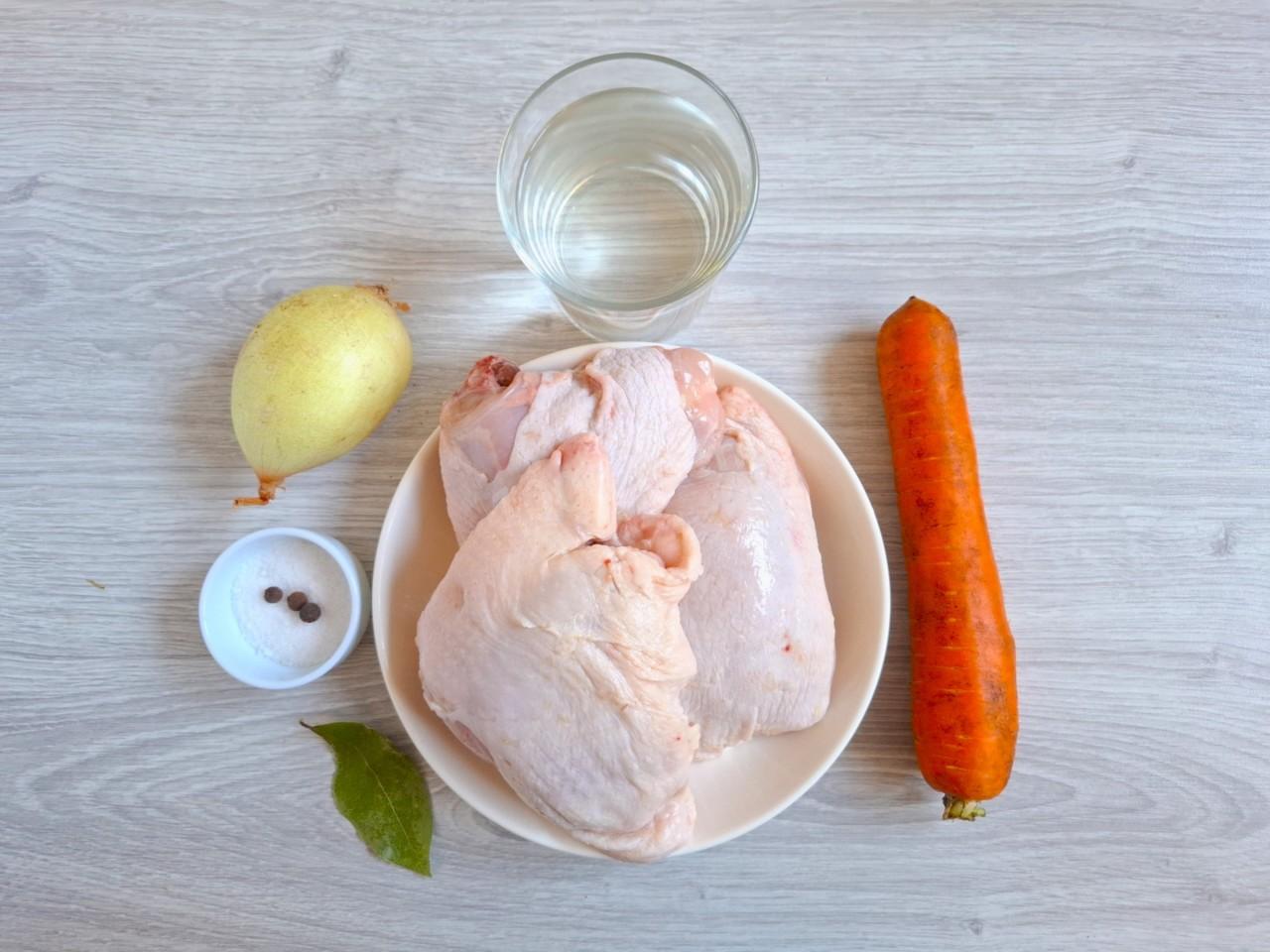 Подготовьте необходимые продукты. Для начала приготовьте бульон. Кроме куриных бедер можно взять любые части курицы. Если мясо заморожено, разморозьте его на нижней полке холодильника. О правильной разморозке читайте ниже. Кроме курицы подойдет любое другое мясо, но калорийность и время приготовления изменятся. Воду берите фильтрованную, вода из-под крана может испортить вкус бульона. Луковицу и морковь очистите, промойте и разрежьте на несколько частей.