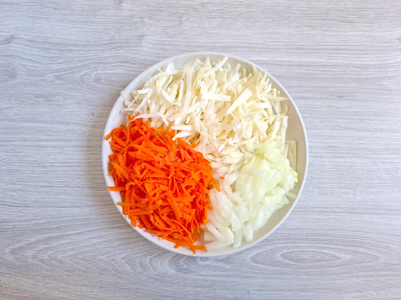 Морковь и лук очистите и сполосните в проточной воде. С капусты снимите верхние листья. Нарежьте капусту тонкой соломкой. Лук нарежьте небольшими кусочками. Морковь натрите на терке с крупными зубцами. При желании можете нарезать морковь брусочками или кубиками. От степени нарезки будет зависеть внешний вид блюда.