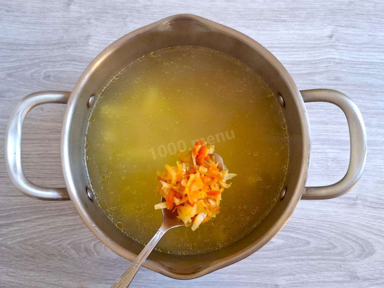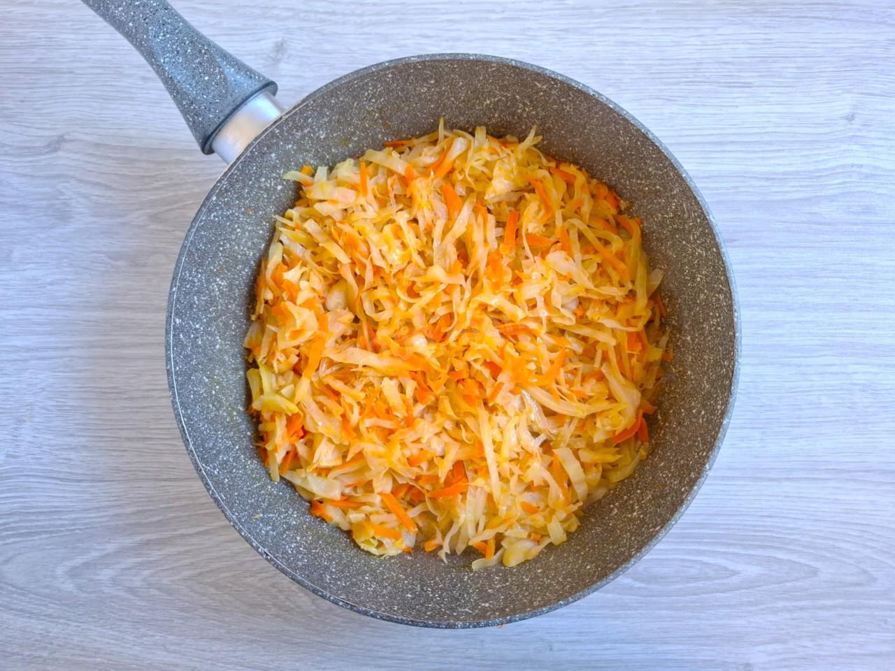 Сковороду с маслом нагрейте на среднем огне и выложите лук и морковь. Обжаривайте около 3-4 минут. Затем добавьте капусту и немного бульона из кастрюли, перемешайте. Потушите овощи еще примерно 5-7 минут. Время зависит от особенностей работы вашей плиты и готовности поджарки. С выбором сковороды и масла вам помогут статьи по ссылкам под описанием рецепта.