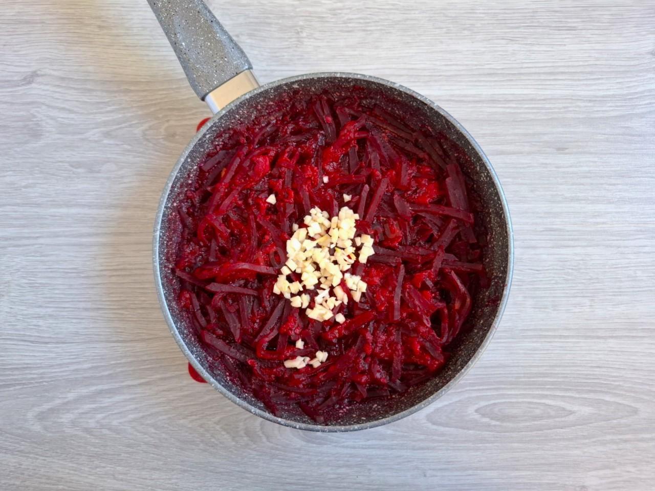 Выложите подготовленную свеклу и натертые помидоры в сковороду. Доведите смесь овощей до кипения, затем нагрев убавьте. Добавьте в сковороду лимонный сок и сахар, если используете. Прогрейте смесь еще пару минут и добавьте очищенный и мелко нарезанный с чеснок, перемешайте. Время зависит от степени нагрева и готовности овощей.
