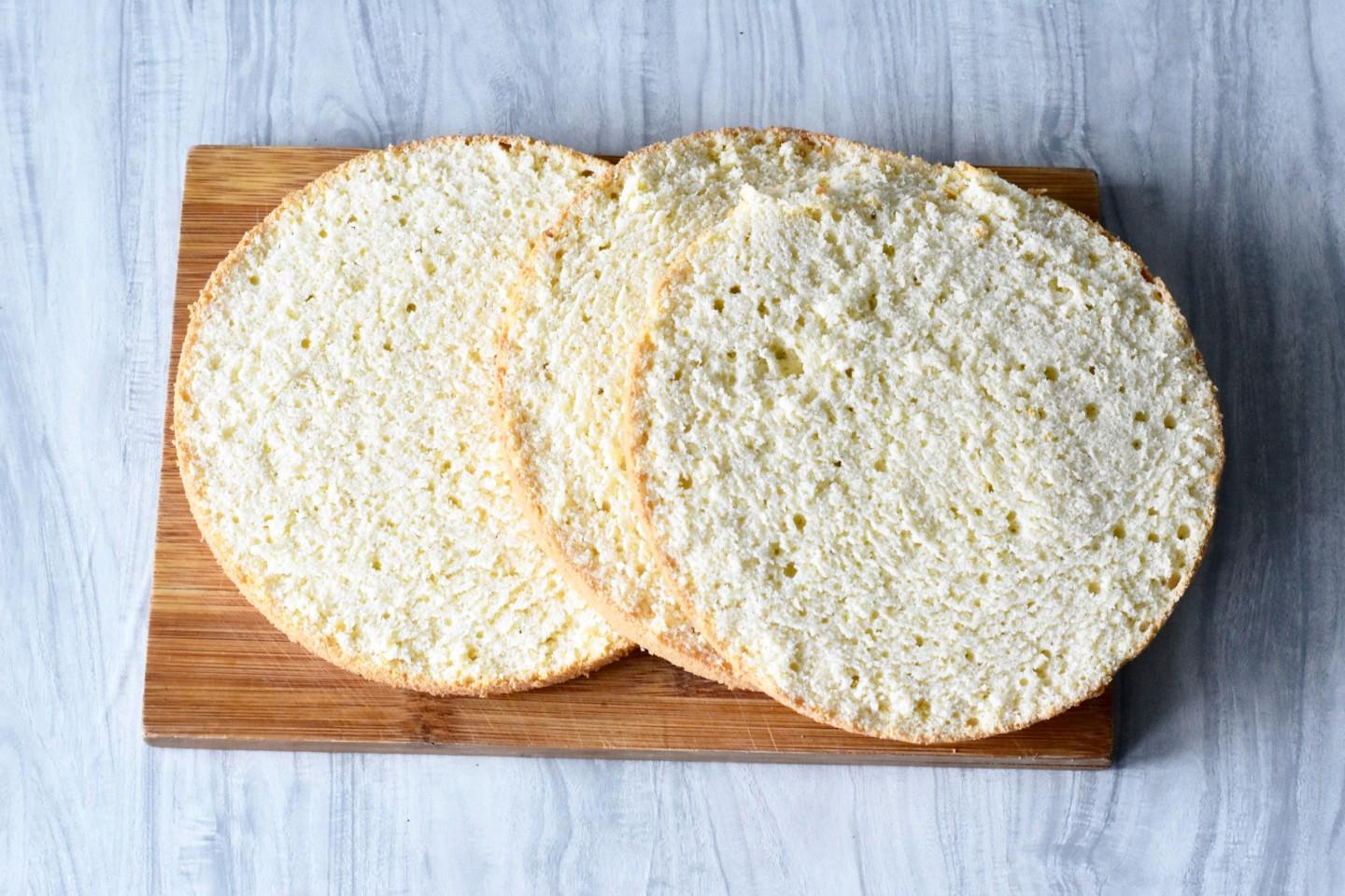 Бисквит охладите. Если есть время, заверните в пищевую пленку и положите на 12 часов в холодильник. Затем разрежьте вдоль на 3 коржа.