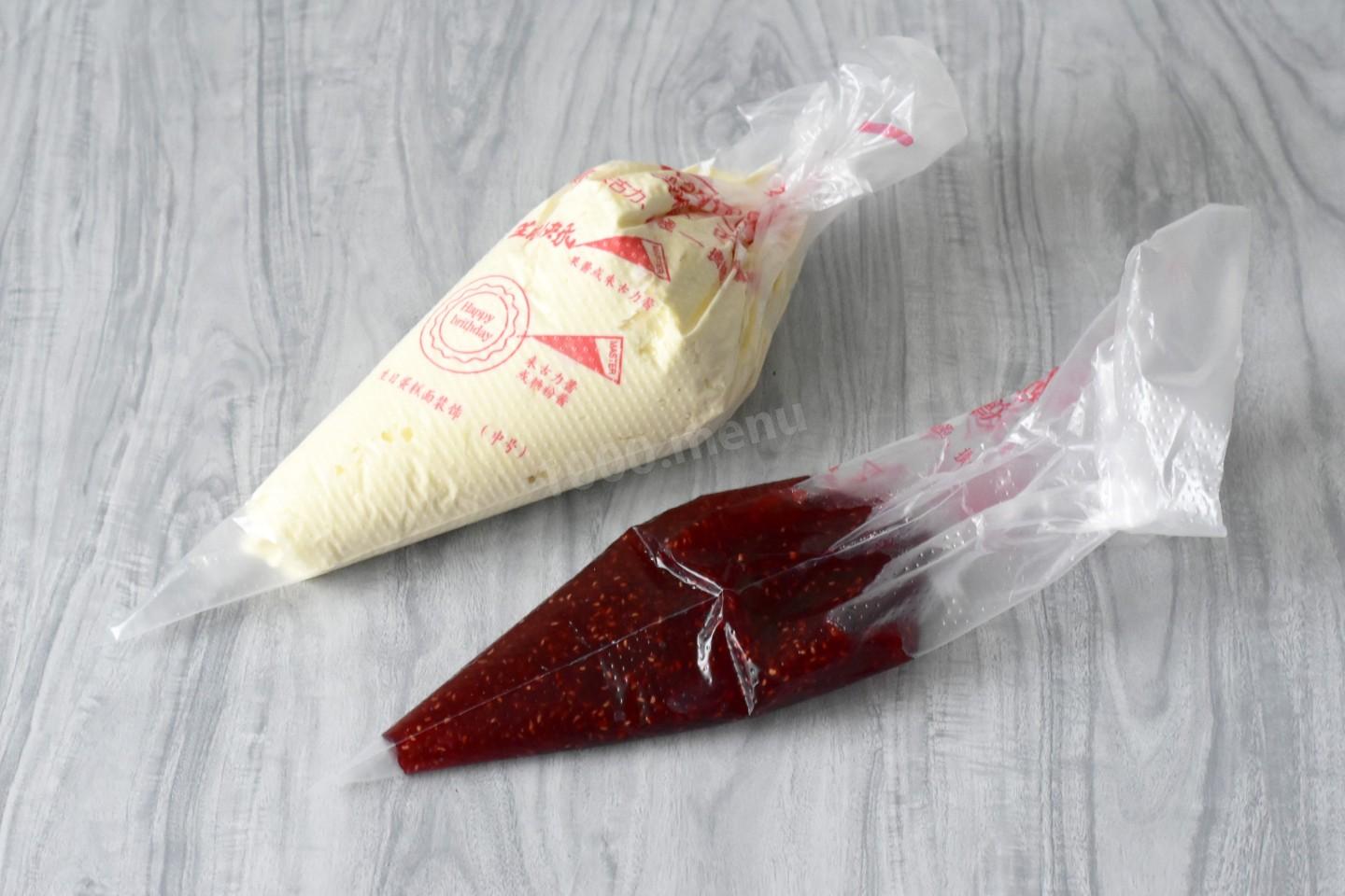 Чтобы крем было проще наносить пена коржи, переложите его в кондитерский мешок и отрежьте кончик. Малиновое варенье также переложите в кондитерский мешок. Как загустить малиновое варенье для торта? Если варенье слишком жидкое, можете уварить его на медленном огне до густоты и охладить.
