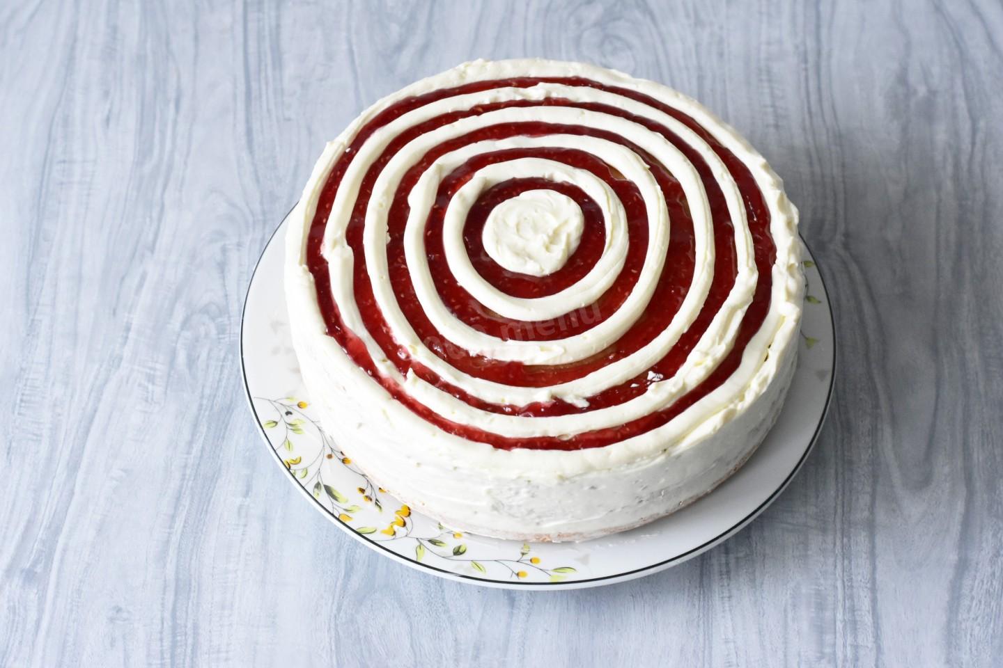 На нижний корж, начиная от центра нанесите круги из крема с промежутками примерно 1 см. В промежутки из кондитерского мешка выдавите малиновое варенье. Аккуратно накройте вторым коржом и также нанесите крем и варенье. Точно также подготовьте третий корж. На поверхности сделайте узор, проведя шпажкой линии от центра к краям. Бока торта выровняйте оставшимся масляным кремом. Поставьте торт на 3-5 часов в холодильник.