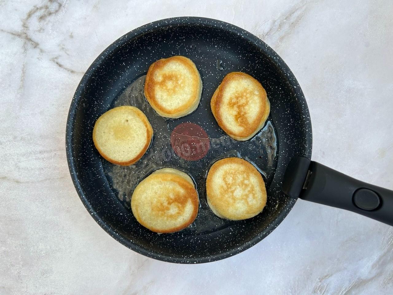 Разогрейте сковороду с растительным маслом. Столовой ложкой выложите тесто и обжарьте на среднем огне 2-3 минуты до золотистой корочки. Затем переверните и обжарьте оладьи еще 1-2 минуты. Точное время приготовления будет зависеть от размера оладьев, особенностей работы вашей плиты и выбранной сковороды. С выбором сковороды и масла для жарки помогут статьи по ссылкам в конце рецепта. Готовые оладьи выложите на бумажное полотенце, чтобы убрать лишнее масло.