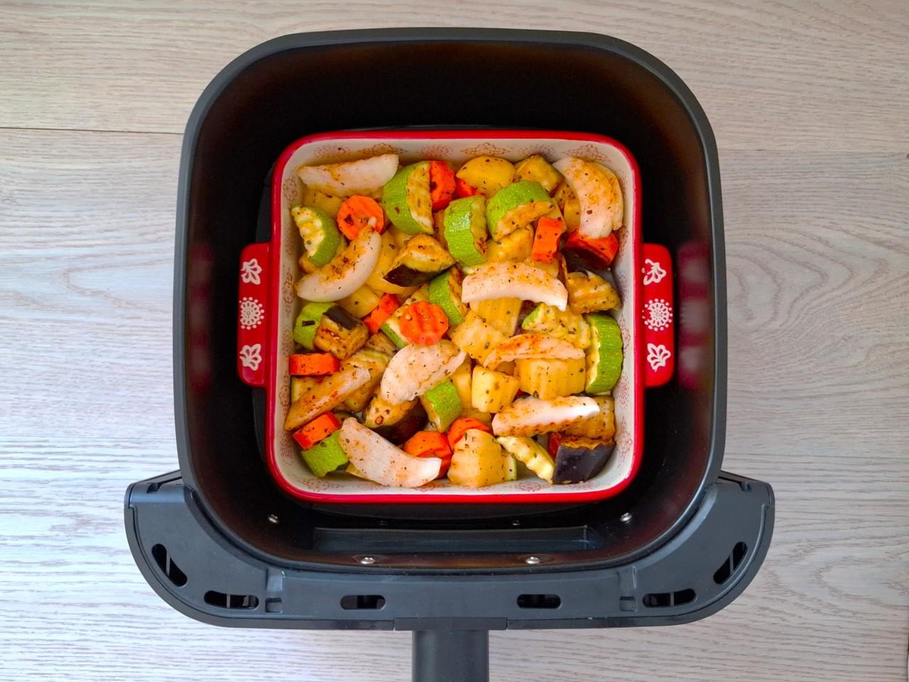 Выложите овощи в форму для выпечки. У меня керамическая размером 20/20 см. Вы можете взять силиконовую, алюминиевую или стеклянную форму. Лучше не выкладывать овощи на решетку или пергамент для сохранения соков. Форму поставьте в чашу аэрогриля.