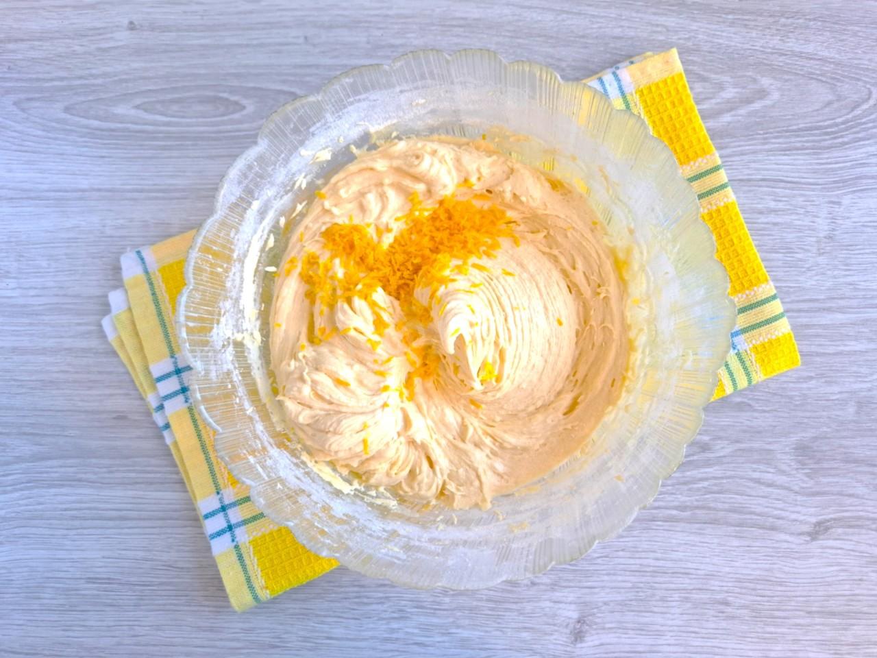 Муки может понадобиться больше или меньше, ориентируйтесь по консистенции теста. Оно должно получиться достаточно густым и воздушным, напоминающим крем. Лимон хорошо промойте в теплой воде и обсушите. С половинки лимона снимите теркой цедру и выжмите сок. Добавьте их к тесту и перемешайте.