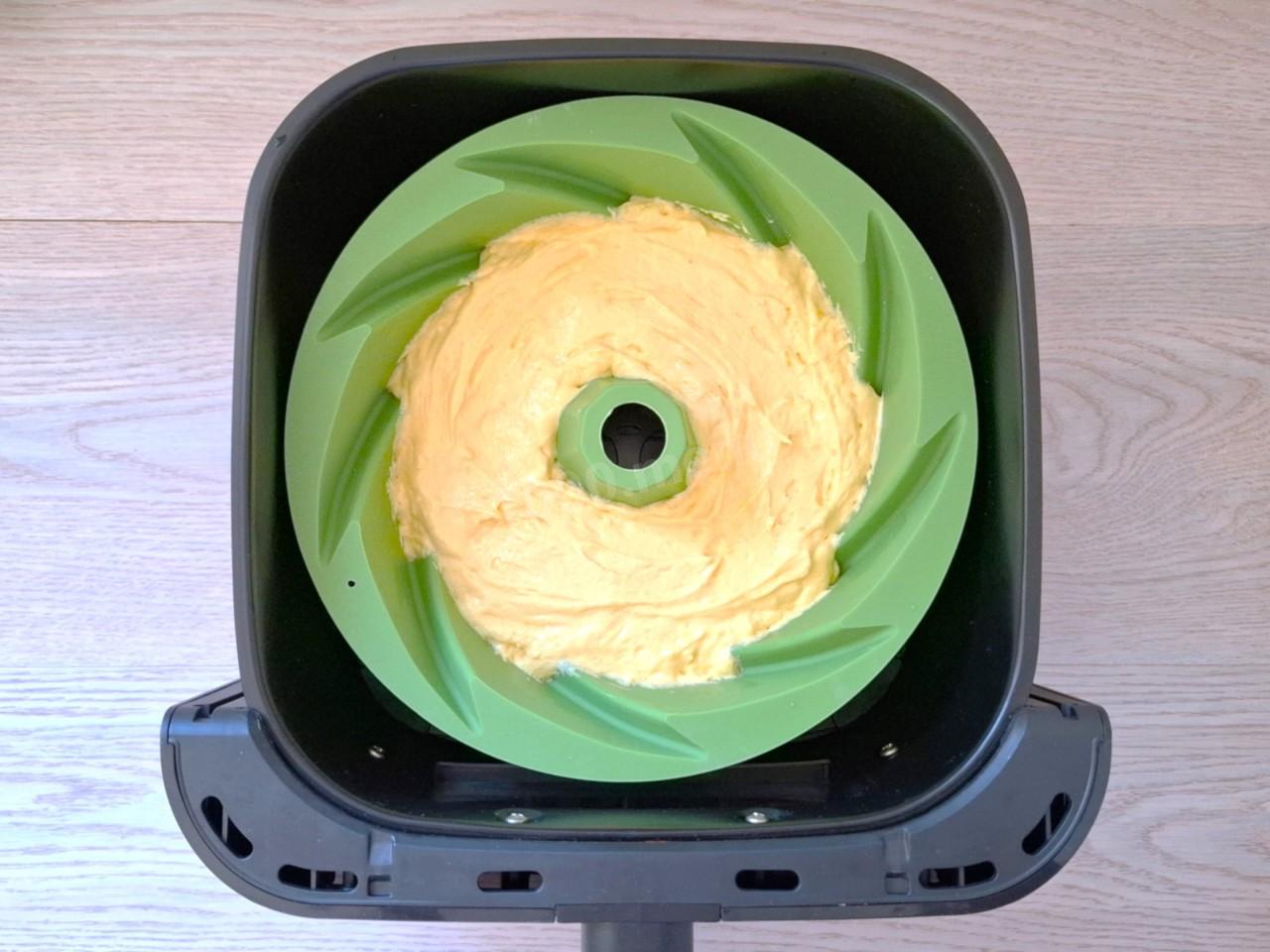 Выложите тесто в силиконовую форму с отверстием. Так кекс лучше пропечется. Учитывайте размер формы, она должна поместиться в чашу аэрогриля. У моей верхний диаметр 24 см. Поверхность теста разровняйте, а форму поставьте в чашу.
