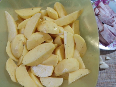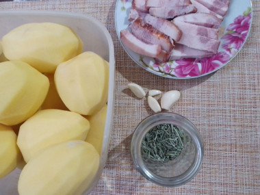 Сделала я запеченный картофель с розмарином. Мне розмарин нравится во всех блюдах и это не стало исключением. Картофель у меня был не молодой, поэтому я решила его очистить и разрезать на дольки. Грудинку взяла копченую свиную. Она вместе с розмарином придала аппетитный аромат и пропитала картофель своим вкусом. Вот только вино я не добавляла, а просто влила чистую воду.