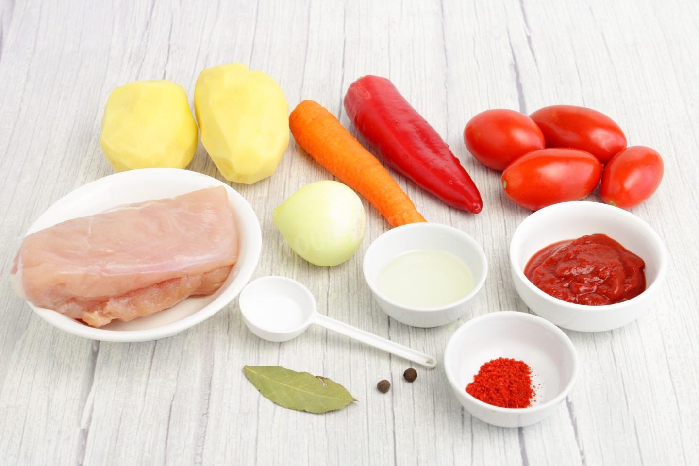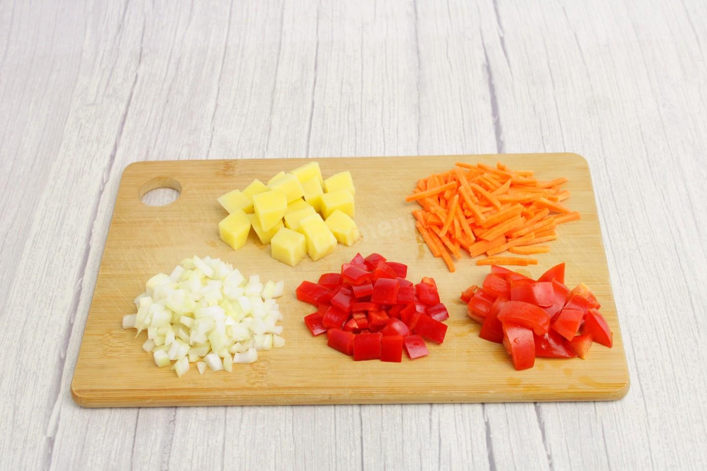 Овощи помойте. Картофель, лук и морковь очистите, сполосните. Болгарский перец освободите от семян и зеленой части. Нарежьте картофель небольшими кубиками. Морковь нарежьте соломкой, а лук – мелкими кубиками. Перец и помидоры нарежьте небольшими кубиками. По желанию можно снять с помидоров кожицу. Как это легко сделать, можно узнать из статьи по ссылке в конце рецепта.