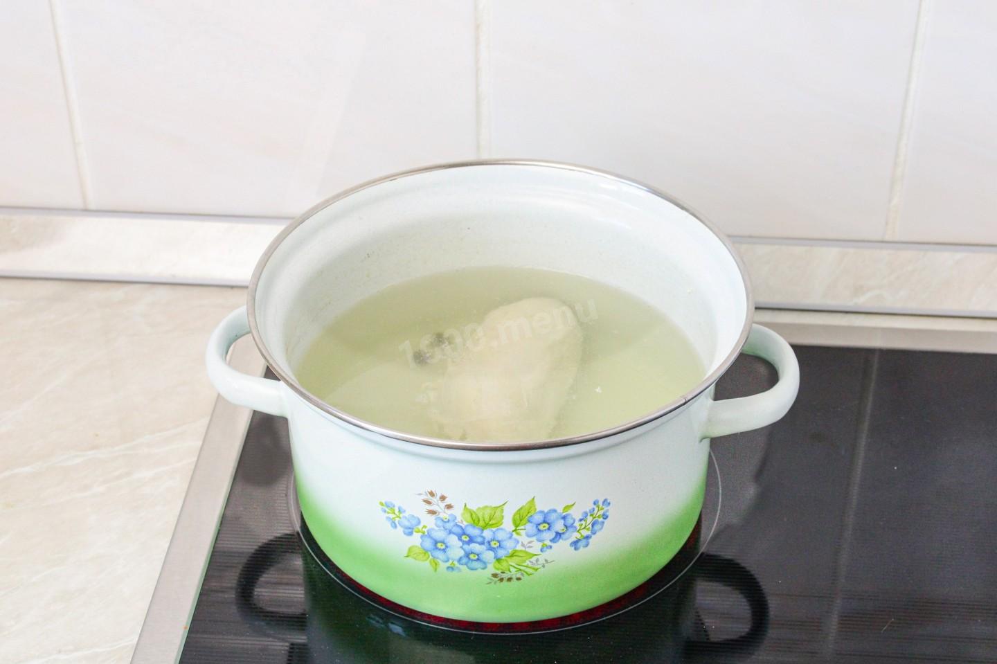 Курицу помойте, опустите в кастрюлю с холодной водой. Выбрать подходящую кастрюлю поможет статья по ссылке после описания шагов. Доведите курицу до кипения, при этом снимите образующиеся пенки. Добавьте в бульон душистый перец. Варите курицу на умеренном огне до готовности. Время варки будет зависеть от размеров кусочков курицы. Для филе достаточно 20 минут.