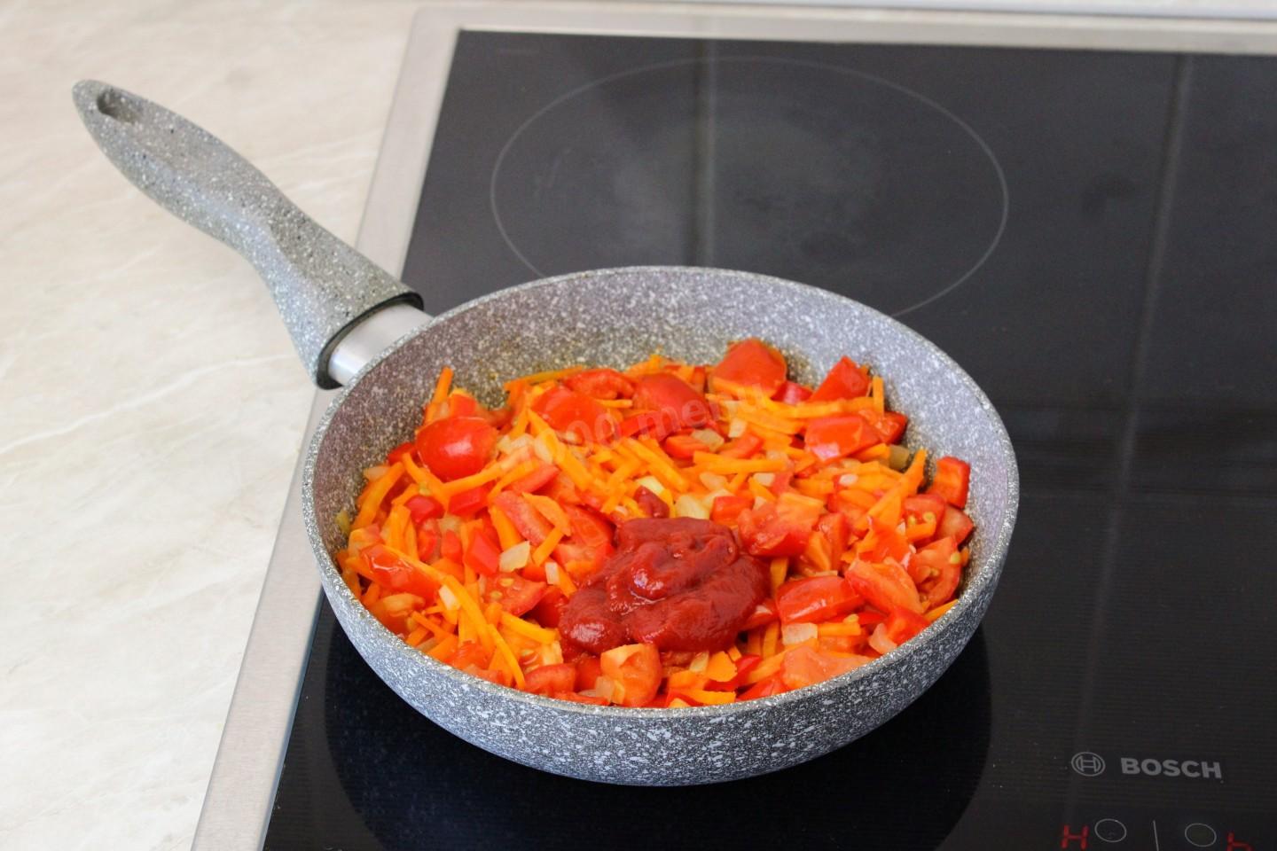На сковороде разогрейте растительное масло. Обжарьте лук и морковь на умеренном огне, помешивая, до средней мягкости. Добавьте в сковороду болгарский перец и помидоры, перемешайте. Обжарьте овощи примерно 3-4 минуты. Выложите к овощам томатную пасту, потушите около 5 минут. Чтобы выбрать сковороду и масло, читайте информацию после рецепта по ссылкам. Готовую курицу предварительно достаньте из кастрюли, немного остудите и нарежьте на небольшие кусочки.