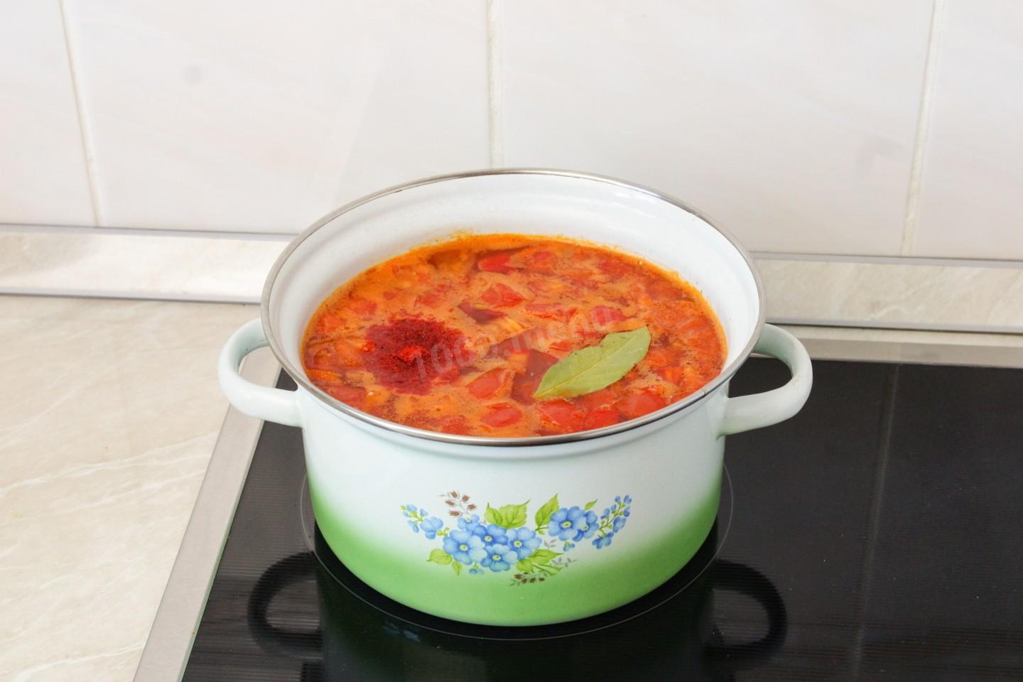 Опустите в суп обжаренные овощи, перемешайте. Суп посолите и варите при слабом кипении 4-5 минут. Добавьте в суп паприку и лавровый лист, перемешайте. Варите суп на слабом огне еще 7-10 минут. Дайте супу настояться под крышкой 10-15 минут.