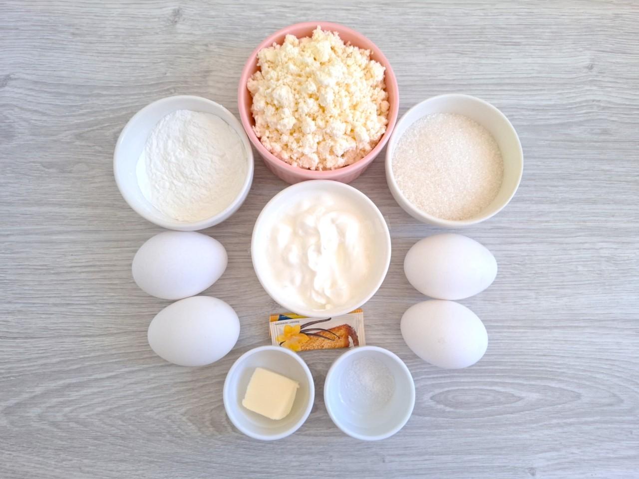 Подготовьте необходимые продукты. Сметана и творог могут быть любой жирности. Главное, чтобы продукты были свежими и натуральными. Если яйца берете крупные, то достаточно будет трех штук. Количество сахара берите на свой вкус или замените его на подсластитель, который не боится термической обработки. Кукурузный крахмал можно заменить на картофельный, но берите его в два раза меньше.