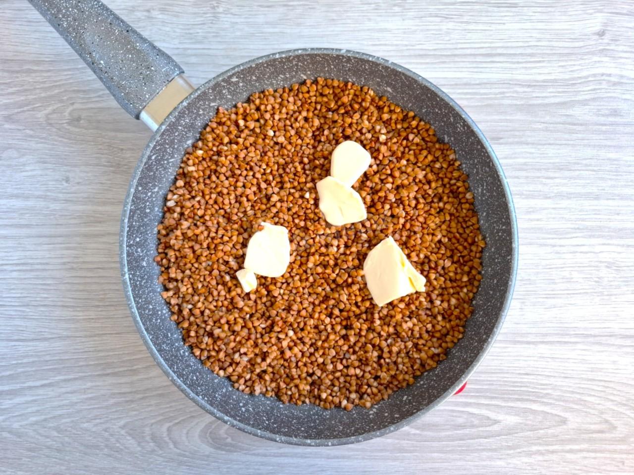 Гречку переберите, хорошо промойте в проточной воде и выложите в разогретую на среднем огне сковороду. Обжарьте крупу около 3-4 минут, помешивая лопаткой. Когда гречка подсушится и появится характерный аромат, добавьте половину сливочного масла. Обжаривайте, перемешивая, примерно 2-3 минуты. Время будет зависеть от особенностей работы вашей плиты и внешнего вида гречки. Каждое зернышко должно покрыться маслом.