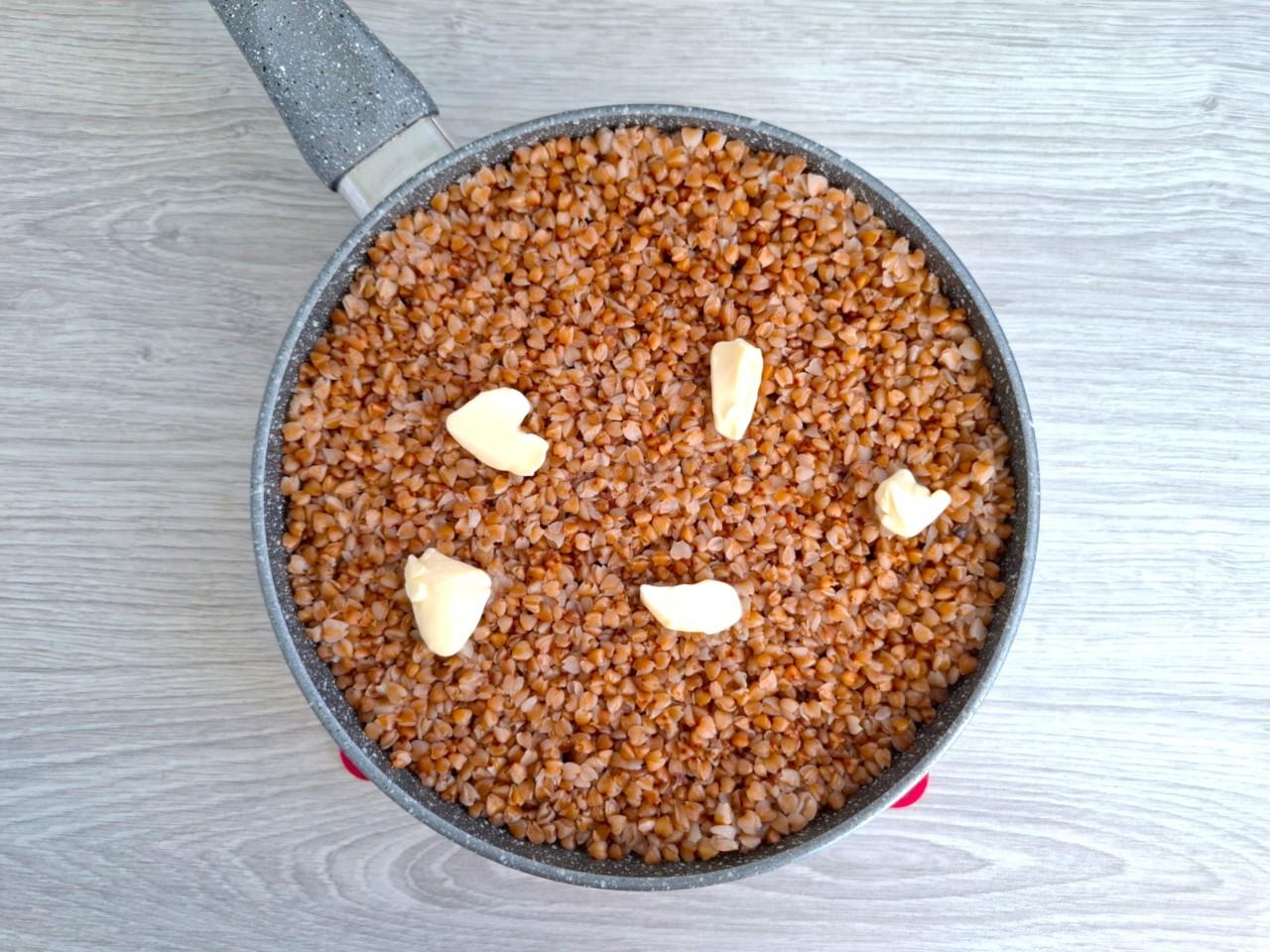 По поверхности готовой гречневой каши разложите оставшееся сливочное масло. Сковороду накройте крышкой и дайте настояться ей около 5-10 минут. Затем кашу перемешайте.