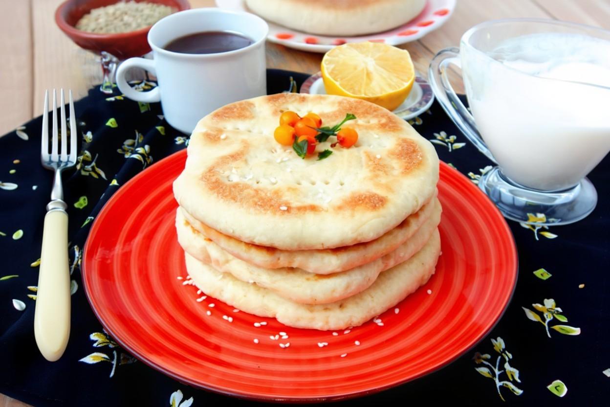 Выложите лепешки на смазанный маслом противень, сверху их смажьте смесью из молока и взбитого куриного яйца и присыпьте кунжутом. Отправьте лепешки в разогретую до 230 градусов духовку и выпекайте около 15 минут. Выньте готовые лепешки, сбрызните их их водой, накройте полотенцем и оставьте на столе на 10 минут.