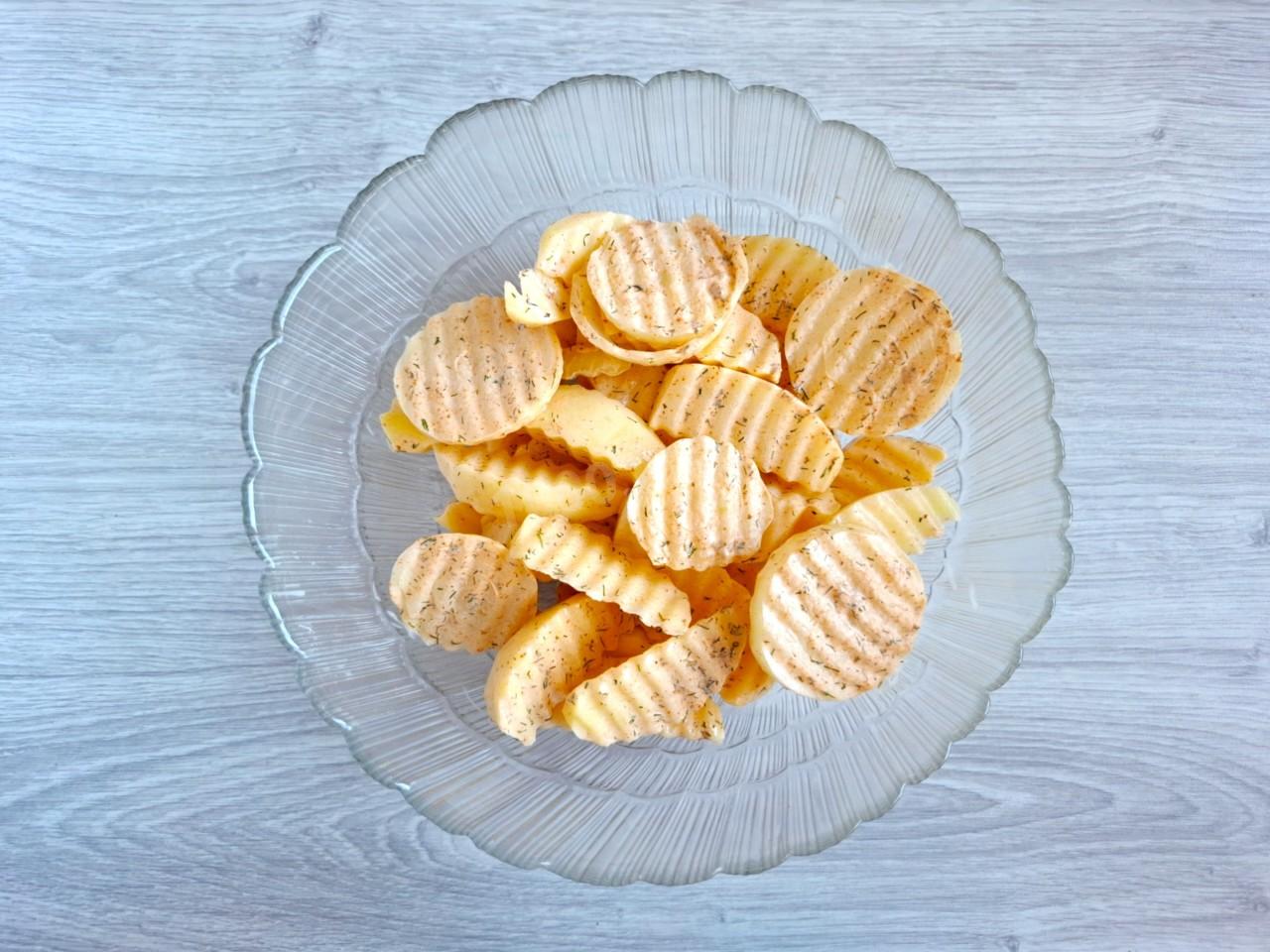 Картошку помойте, обсушите и почистите от кожуры при помощи ножа или овощечистки. Нарежьте картошку дольками примерно одной толщины, я воспользовалась фигурным ножом. Лук очистите от шелухи, сполосните и нарежьте кольцами. Добавьте к овощам оставшийся маринад и перемешайте. Полезную информацию о выборе картофеля читайте под описанием рецепта.