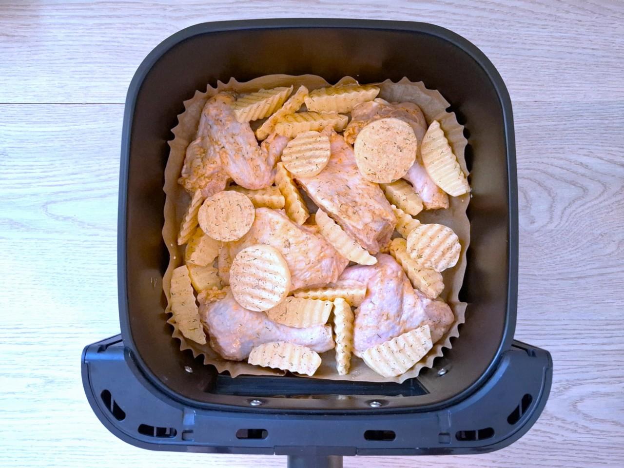 Чашу аэрогриля застелите пергаментом и выложите на него картофель и курицу в один ряд. По желанию можете использовать силиконовую или алюминиевую форму для запекания. Не перегружайте решетку аэрогриля, чтобы горячий воздух мог свободно циркулировать и равномерно пропекать картошку и курицу со всех сторон. Подробнее о выборе пергамента читайте в статье по ссылке под шагами.